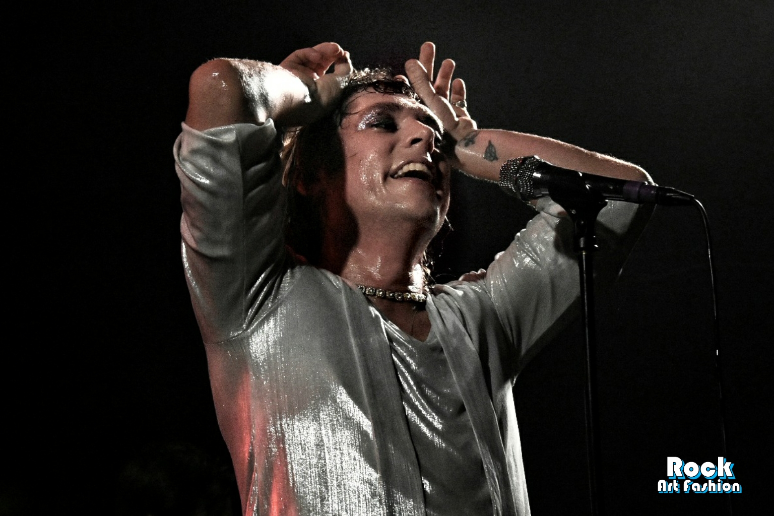 Maquillage glamour pailleté sur les yeux, pantalon noir en cuir, chemise brillante, bottines rock blanches imprimée des lèvres rouges, le chanteur incarne à la perfection le frontman glam rock. Il danse, saute, exécute des pirouettes, tout en encourageant la foule à agiter et à taper les mains au-dessus de leurs têtes. Il touche les mains et les têtes des premiers rangs. Adam et Jed sautent et sillonnent la scène pour engager la foule.