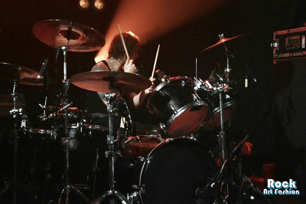 Les 3 sont vraiment très proches devant la foule, juste en bord de la scène tandis que Geth à la batterie se déchaine derrière ses fûts en brandissant ces baguettes.