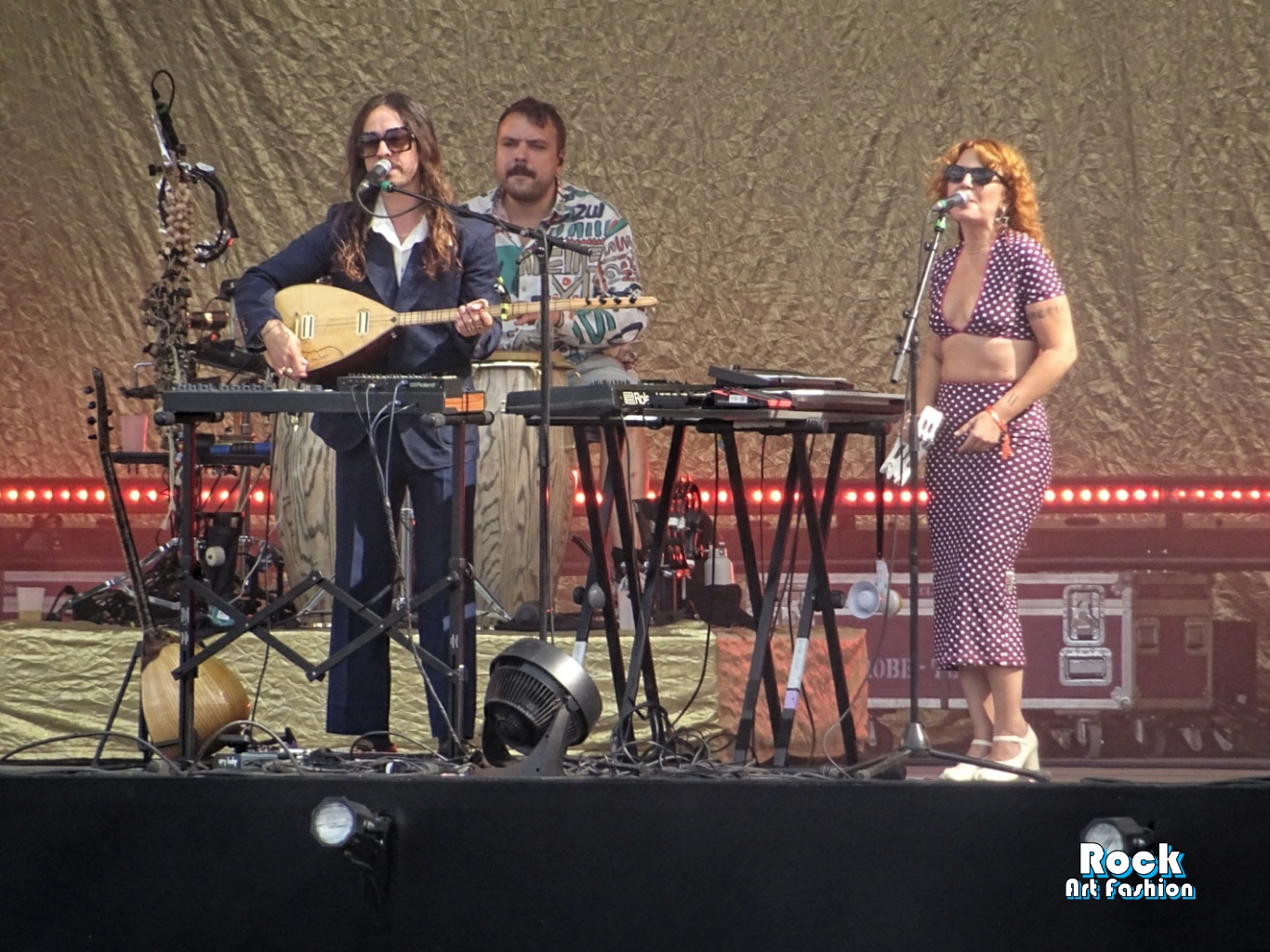 We start with ALTIN GUN and it’s rather a great discovery. The band mixes oriental sounds, electric guitars, psychedelic organs, traditional instruments, all on very funky rhythms. Two of its members are from Turkey, while the other four are Dutch. The singing is pleasant but incompressible, obviously, because they sing in Turkish. Psychedelic rock and folk with traditional Turkish influences, exotic melodies, their show appeals to smiling and cheerful audience who move in rhythm under the great sun that bathes the Grande Scène this afternoon.