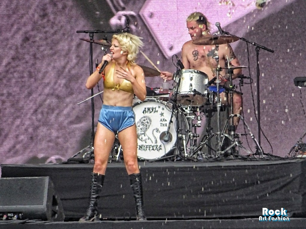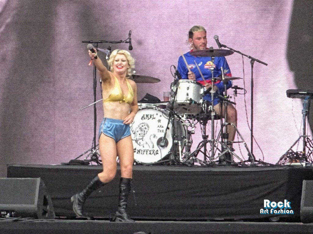 De retourà la Grande Scène on assite à une véritable tornade : AMYL & The Sniffers. Le quatuor australien met le feu et déclenche une véritable hystérie parmi les festivaliers avec des sonorités punk rock brut sauvage. L’impressionnante chanteuse, Amy Taylor, look 70s avec mini short bleu, haut doré, bottes, brushing façon « Charlie’s Angels -Droles de Dames », et rouge à lèvres rouge intense qui déborde au tour de sa bouche est une véritable boule de feu.