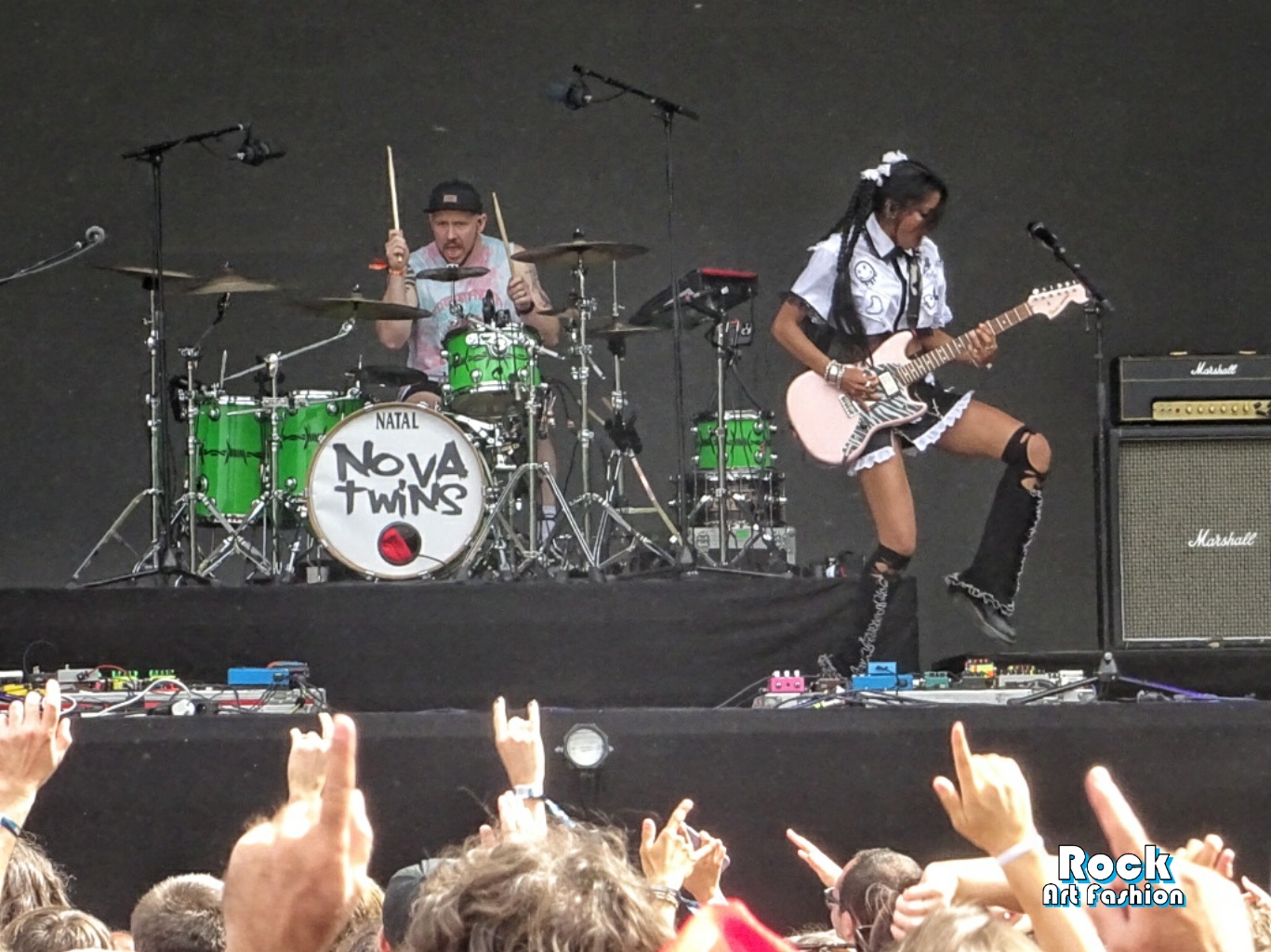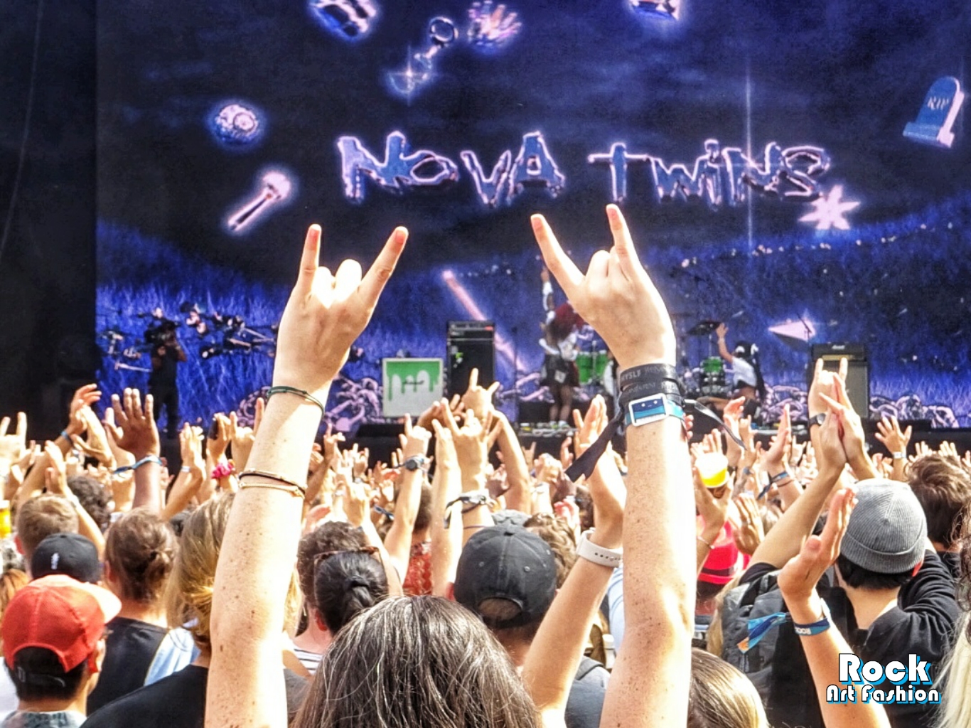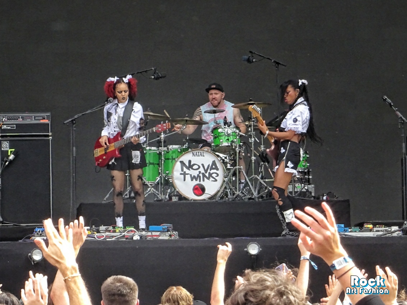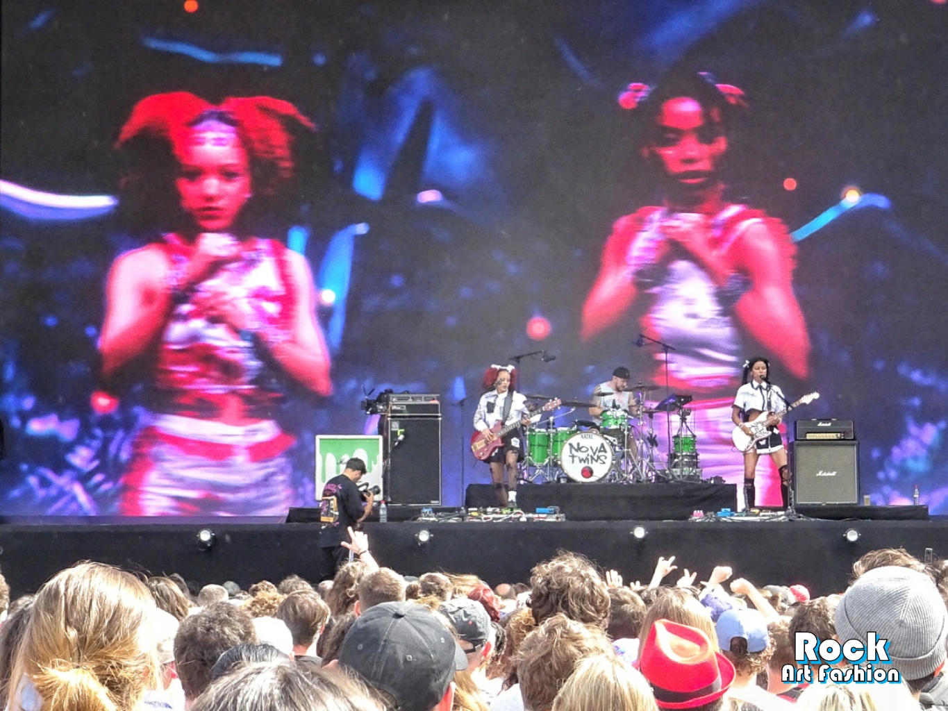 On arrive très tôt pour ne pas rater le Amy Love (chant, guitare) et Georgia South (basse) alias NOVA TWINS qu’on attendait voir sur scène depuis bien longtemps. Le duo londonien accompagné par un batteur délivre un show fracassant avec une présence scénique super énergique, des sonorités punk rock ravageur, riffs hardcore, hip hop abrasif et mélodies accrocheuses.