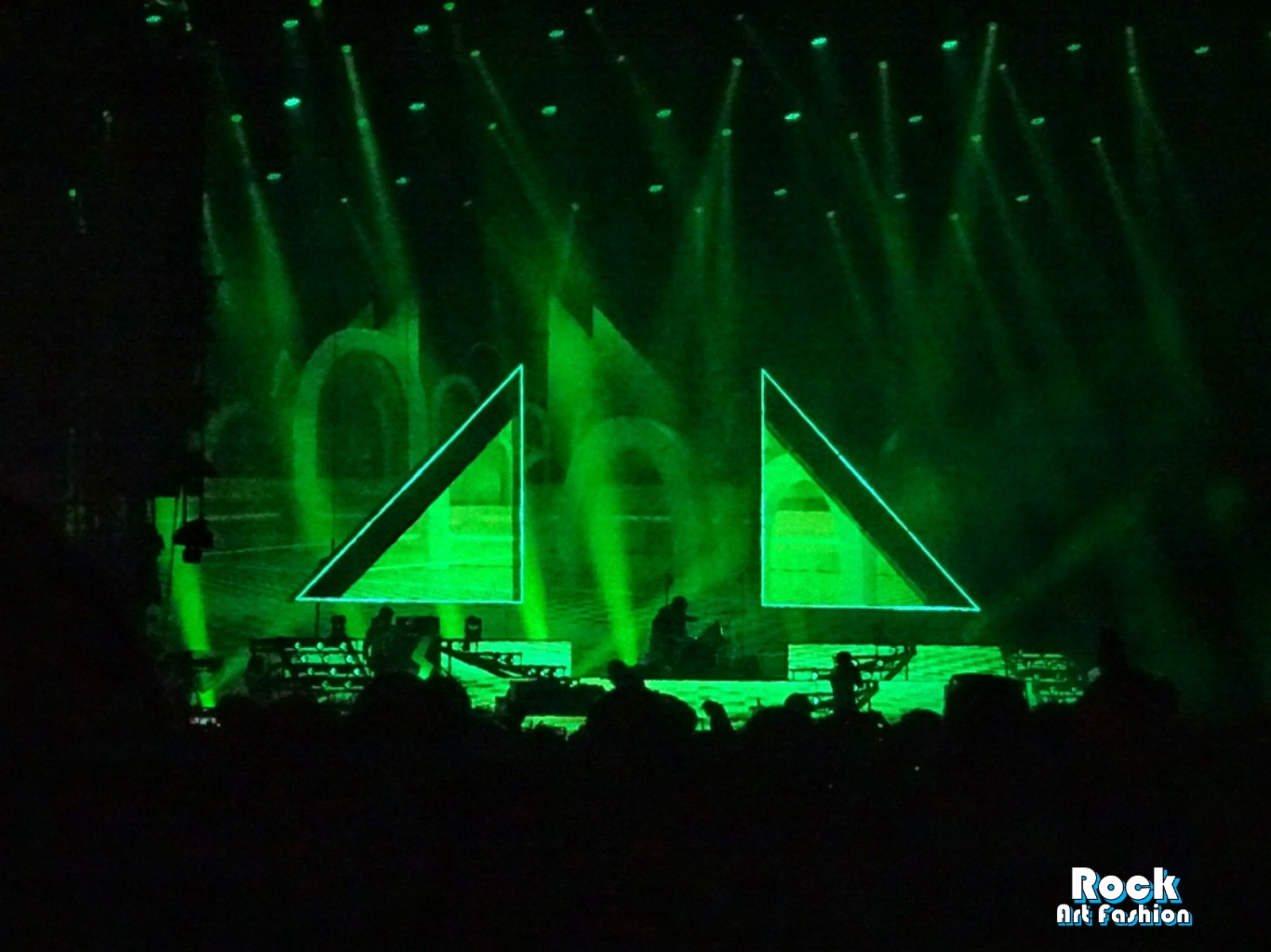 La scénographie a été très jolie, avec des triangles des néons en fond de scène et jeux de lumières des toutes les couleurs, mais les musiciens ont évolué dans une obscurité totale de début à la fin.