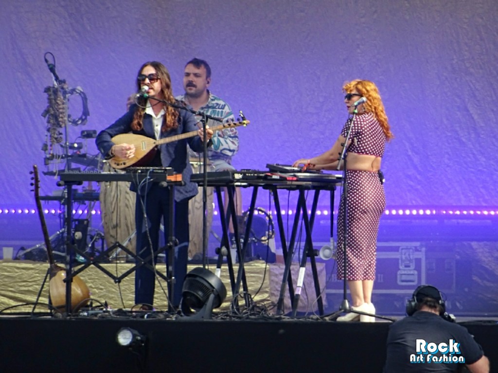 On démarre avec ALTIN GUN et c’est plutôt une belle découverte. Le groupe mêle les sonorités orientales, des guitares électriques, des orgues psychédéliques, des instruments traditionnels, le tout sur des rythmiques très funky. Deux de ses membres sont originaires de Turquie, tandis que les quatre autres sont néerlandais. Le chant est agréable mais incompressible, évidement, car ils chantent en turc. Rock et folk psychédélique aux influences traditionnelles turques, des mélodies exotiques, leur show plait aux festivaliers souriants et de bonne humeur qui bougent dans le rythme sous le grand soleil qui baigne le Grande Scène en cet après-midi.