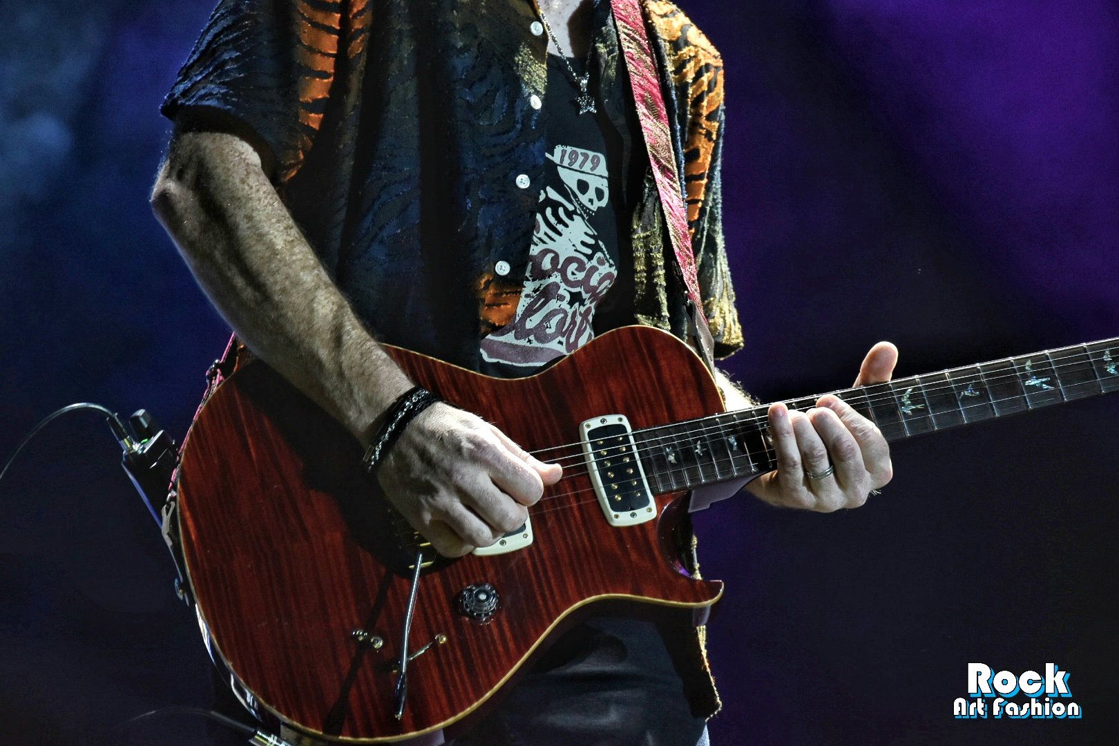 The sacred monster with long red hair (Dave of course!) dressed all in black (small detail, the shirt is unbuttoned at the belly, but it doesn’t seem to bother him) is in Olympic shape and constantly moves on the stage while carefully observing the delirious crowd. He seems to be in a very good mood, because in addition to his usual festival of grimaces, we will see many smiles and friendly gestures.