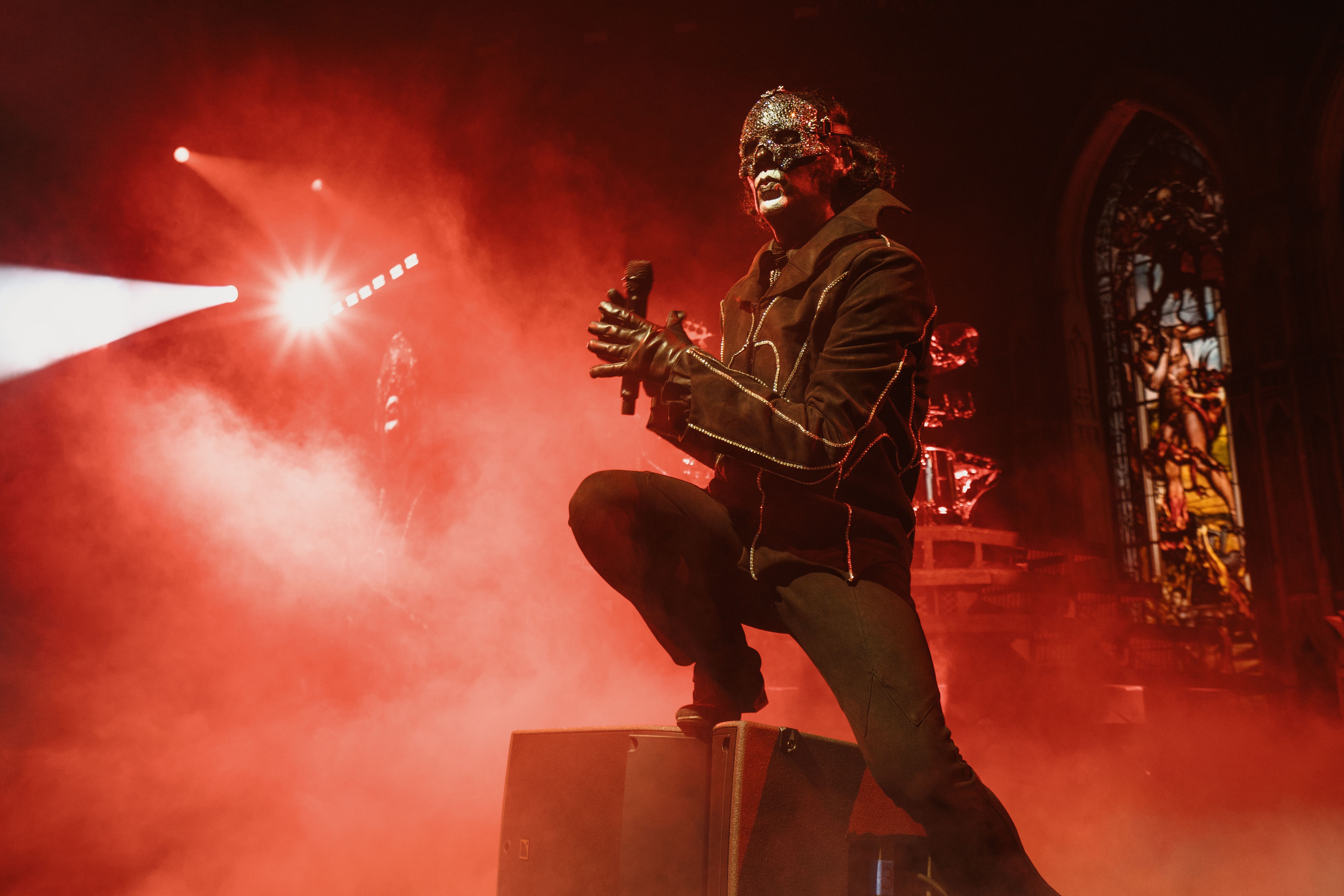 Il apparait et disparait sous nos yeux et impressionne avec ses multiples changements de tenues : il est mince et élégant dans son costume noir cuir-satin, ses vestes pailletées : rose ou argentée ou dans ses tenues pontificales flamboyantes mais beaucoup plus chic et sobres qu’avant. Plus raffiné est aussi son nouveau masque métallique qui couvre maintenant partiellement son visage et qui sera remplacé vers le milieu du show par un autre incrusté des pierres qui brille de mille feux.