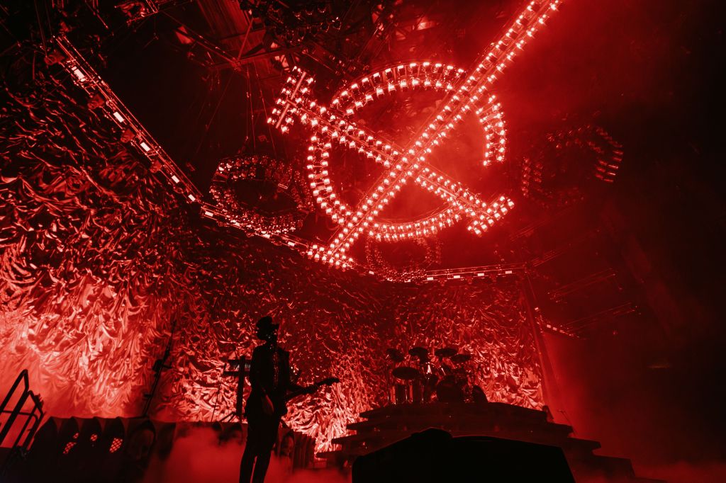 La scène est surplombée par une immense rampe lumineuse en forme du logo du groupe : un G fusionné dans une croix renversée.
