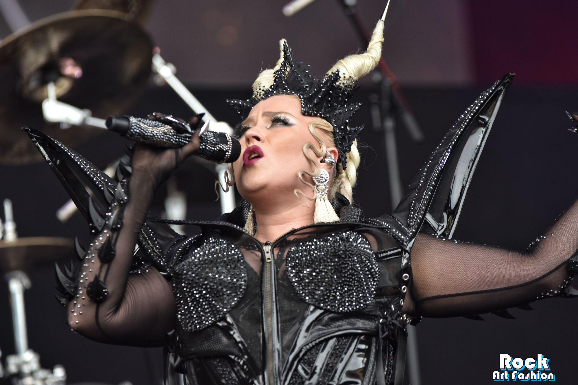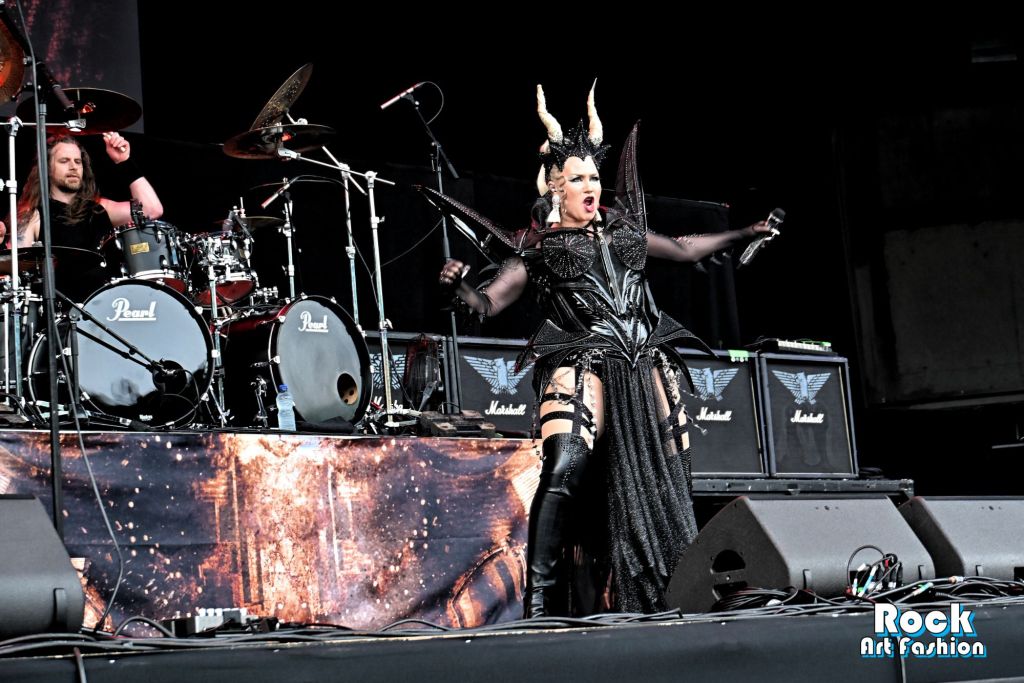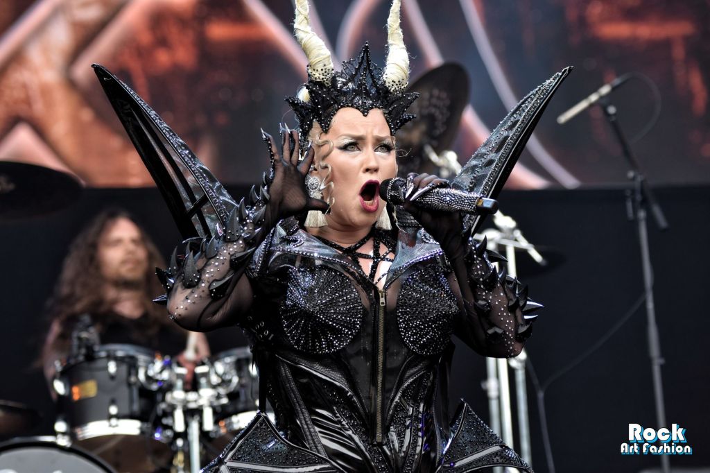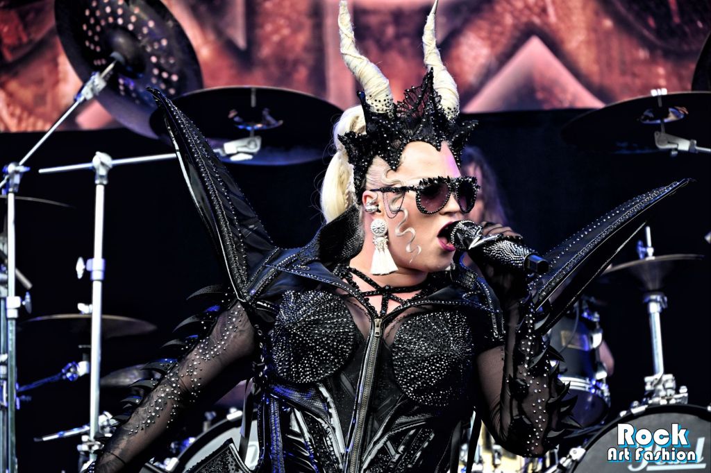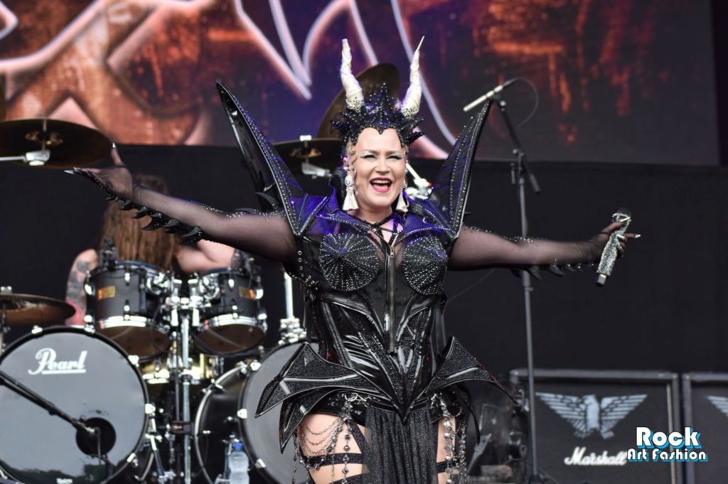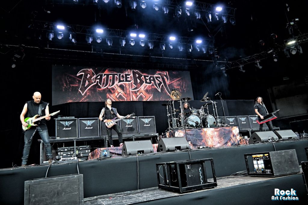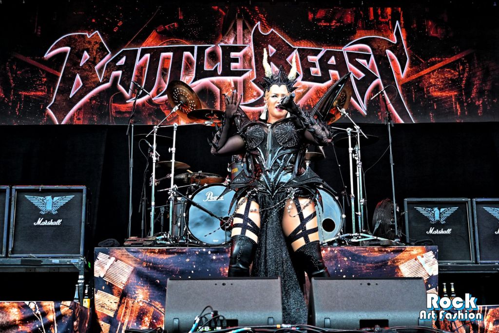 Deuxième sur scène à 18h30, le groupe finlandais Battle Beast sera une grande découverte pour moi. 15 ans d’existence, 6 albums à leur actif, le combo emmené par chanteuse Noora Louhimo, va nous offrir un puissant mix de heavy et de power métal tendance symphonique combiné à des éléments pop très rythmés et surtout des refrains accrocheurs imparables.