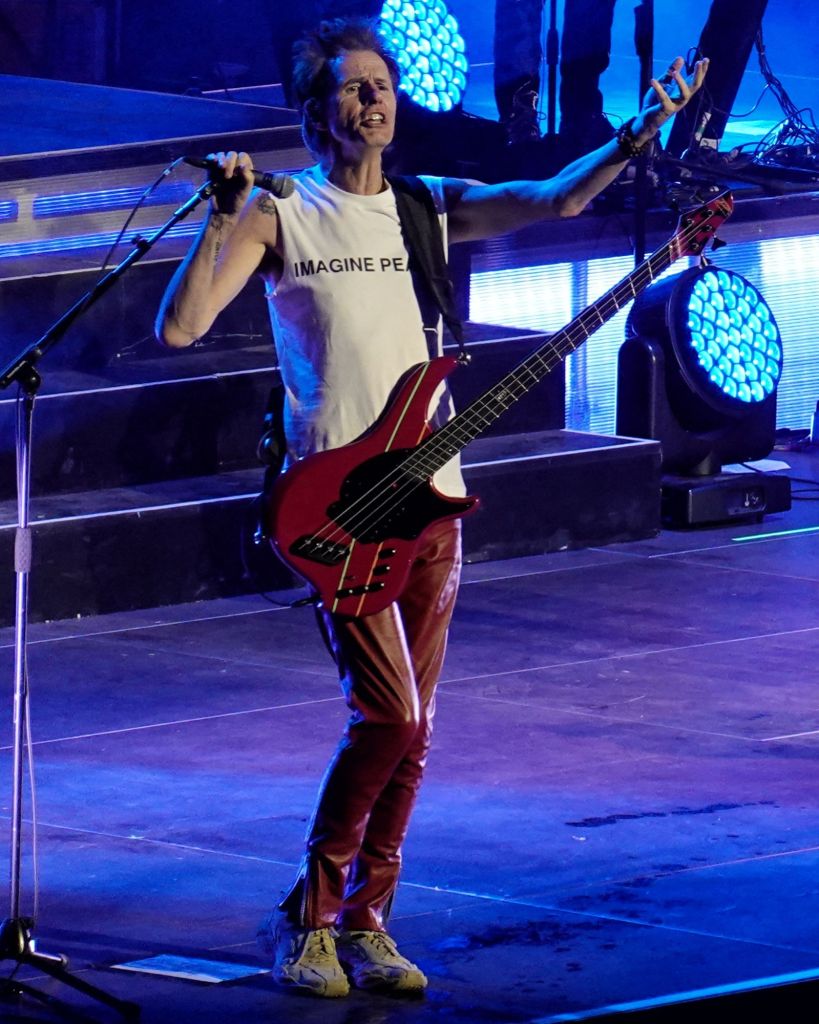 Simon Le Bon changed several times. To his white pants he will combine an elegant black shirt, a white jacket or a T-shirt with the band’s effigy. John Taylor will first combine his red leather pants with a black shirt changed for the “Imagine Peace” T-Shirt, the T-shirt from the Yoko Ono exhibition “Dream Together” which is currently taking place at the Neue Nationalgalerie in Berlin (an exhibition that we highly recommend if you are in the area).