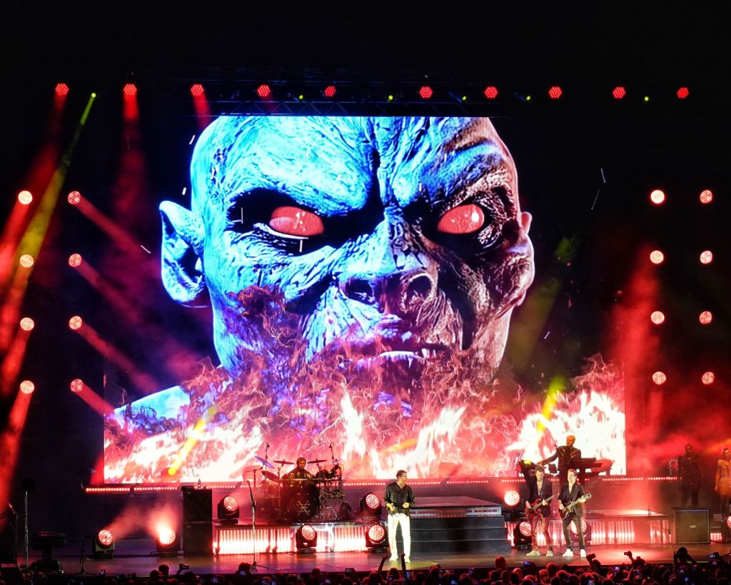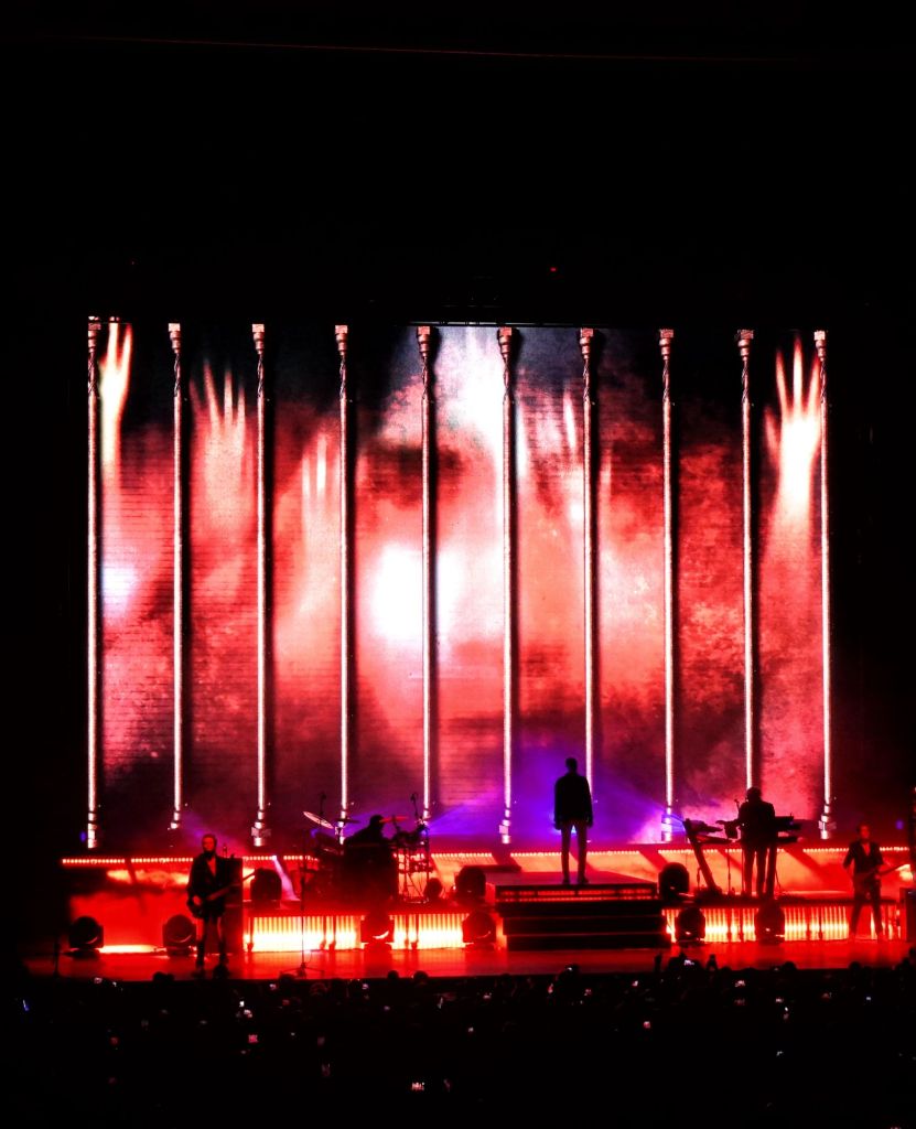 Peu après 21h, c’est enfin le tour de DURAN DURAN. L’intro atmosphérique de Velvet Newton retenti et le groupe apparait en images de synthèse sur l’écran gigantesque situé derrière la scène.