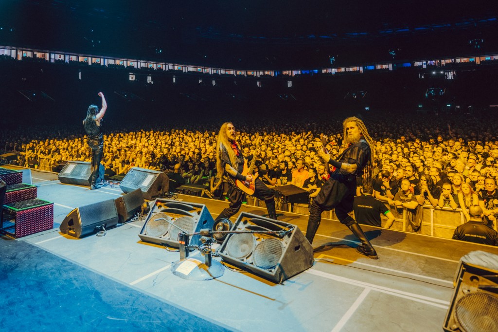 Cette salve explosive d’ouverture mettra les fans KO. Enormes cris et ovations, l’aréna vibre et bourdonne sous les sonorités heavy metal fantastiques. Le son est très bon et les visuels projetés sur le gigantesque écran qui domine la ligne de fond sont spectaculaires. Des deux côtes de la scène, il ya deux écrans plus petits qui diffusent plutôt des images des musiciens.