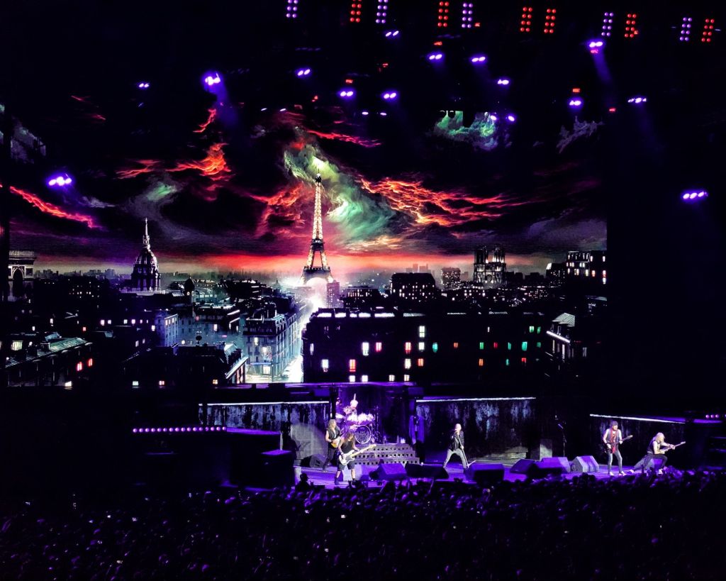 Et puis les images changent et nous voilà à Paris, avec ses monuments : la Tour Eiffel, Notre-Dame de Paris, le Panthéon, l’Arc de Triomphe projetés sur les écrans et les Iron Maiden qui débarquent sur scène pour jouer en enfilades trois morceaux frénétiques et rares en live extraits de l’album Killers sorti en 1981: Murders in the Rue Morgue, Wrathchild et Killers.