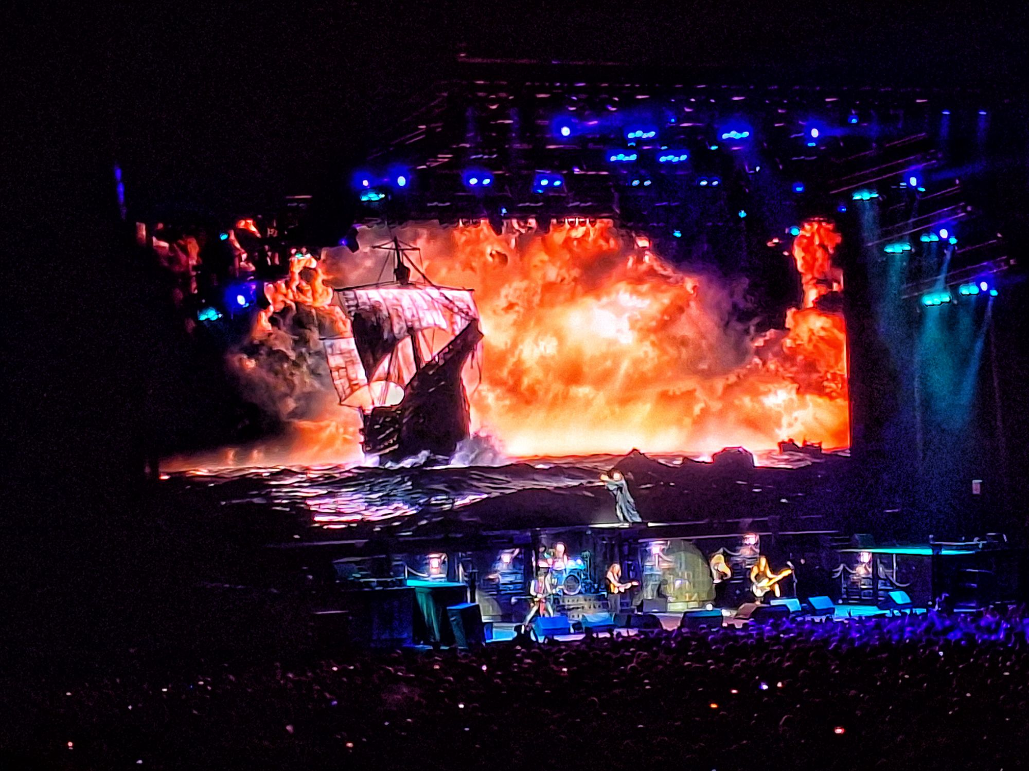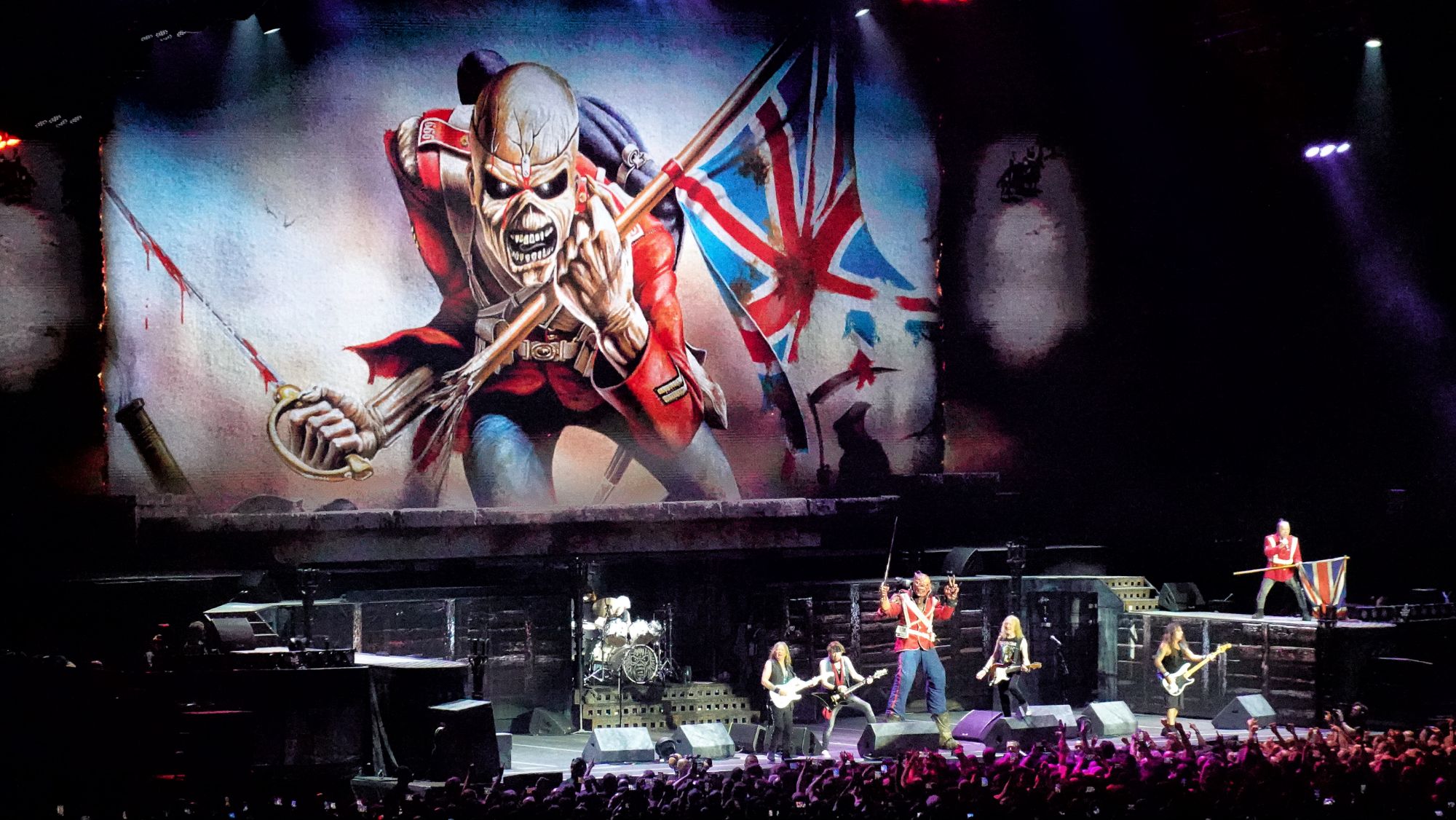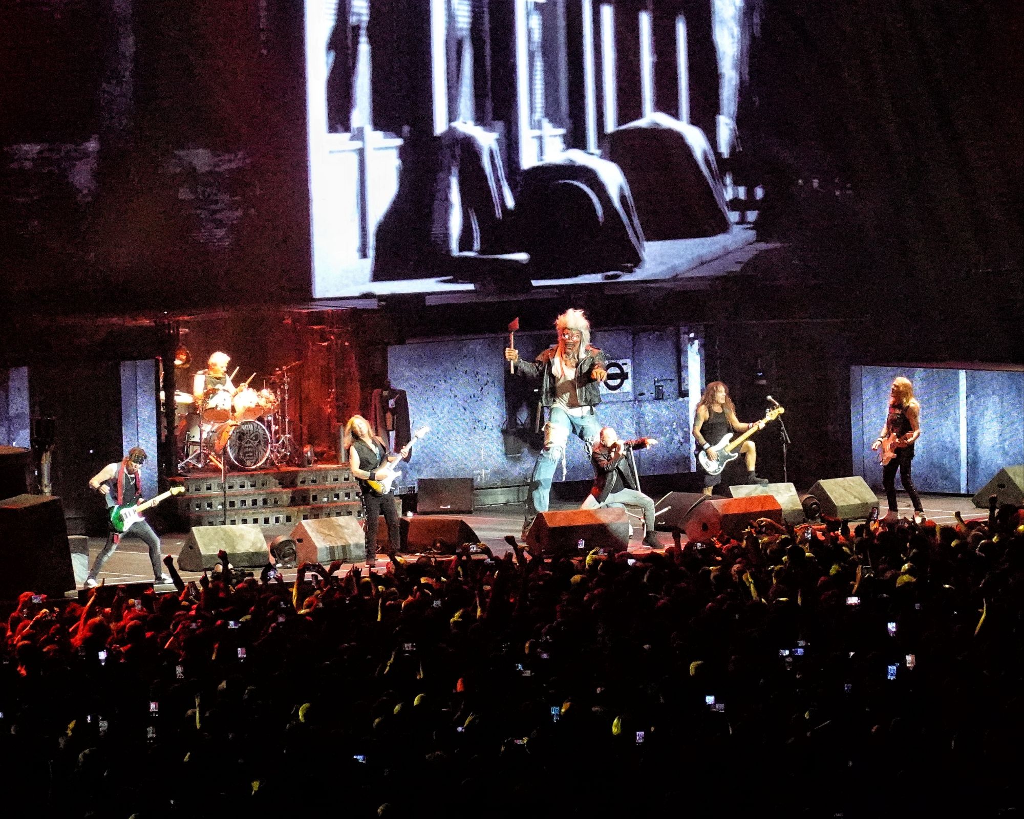 A gigantic red-eyed Eddie, dressed in the same way as Bruce, makes a formidable appearance on Killers. With a bloody axe in his hand, he strode on stage and seemed to want to throw it at poor Janick Gers’ head. The audience is delighted and manifests itself with enormous fervour. The atmosphere is electric.