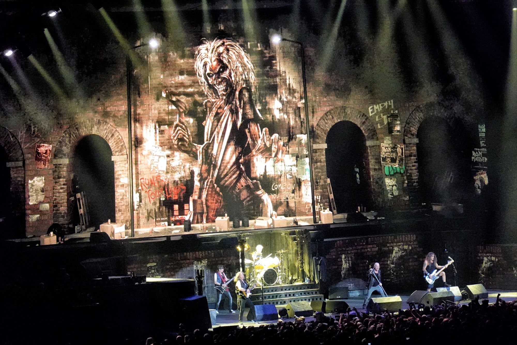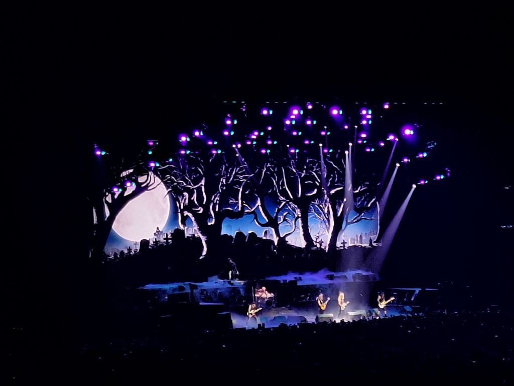 20h50, le titre Doctor Doctor du groupe anglais UFO résonne dans la salle et le public commence à rebondir. Les lumières s’éteignent et en fond de The Ides of March, les célébrations démarrent dans les sombres ruelles de Londres qui sont projetés sur l’écran impressionnant qui se dévoile devant nos yeux. La caméra passe devant de façades des pubs, des maisons avant de s’aventurer dans un tunnel et de tomber nez à nez avec Eddie !