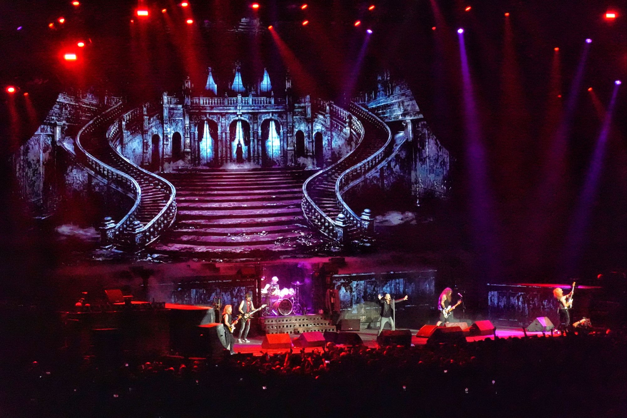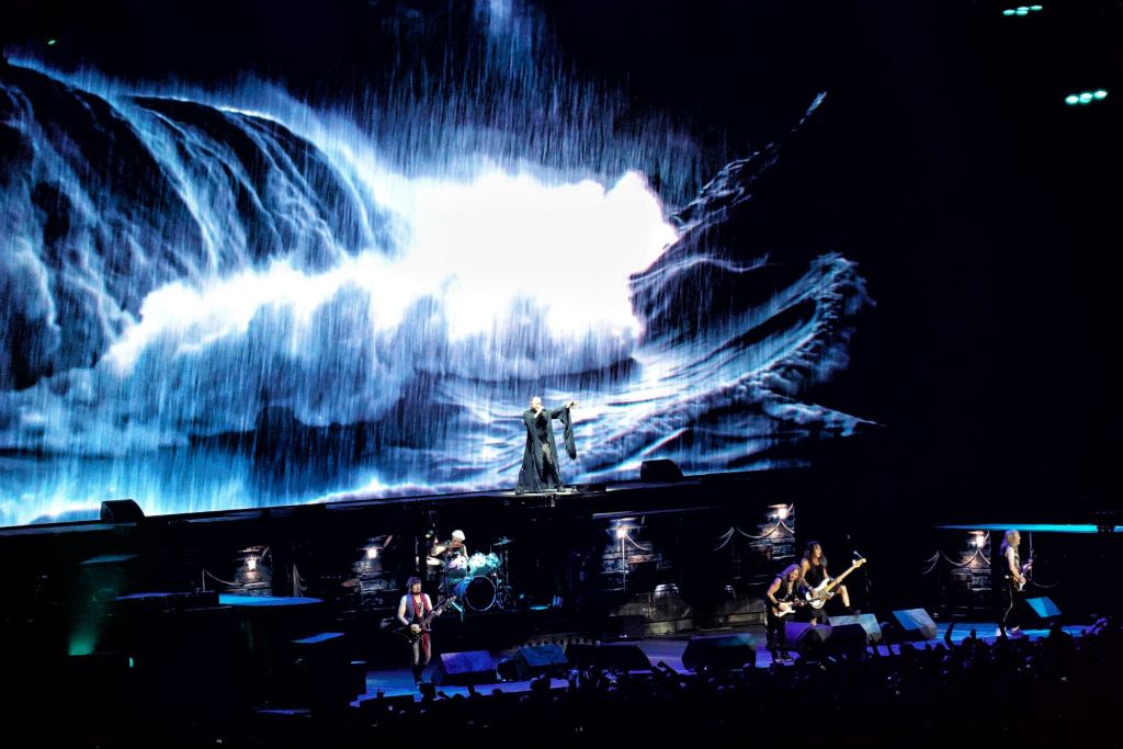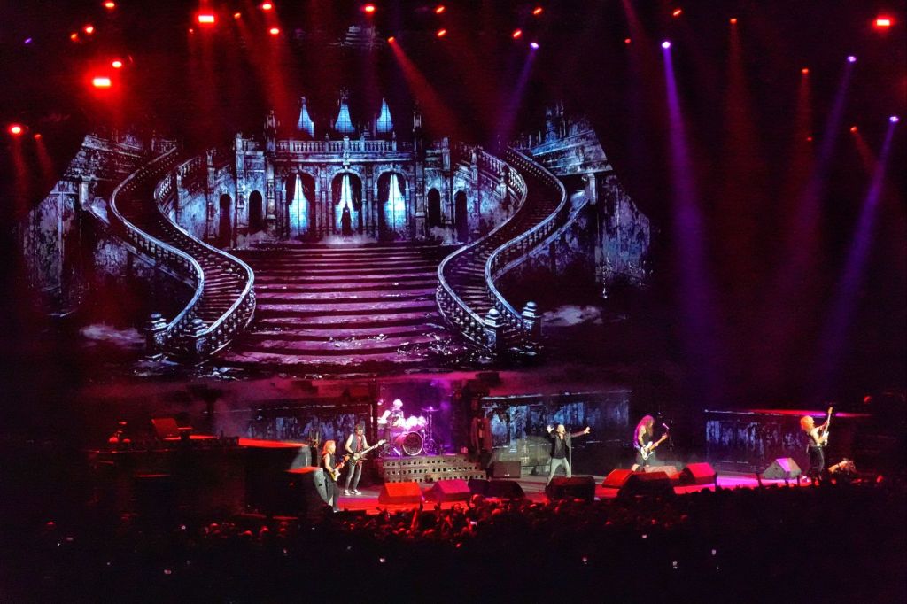 Avant d’interpréter Phantom Of The Opera, Bruce Dickinson prendra la parole en français, langue qu’il maitrise très bien (le chanteur vit à Paris depuis longtemps). Il va nous parler avec émotion de ces 50 ans de carrière et il profite également pour présenter Simon Dawson, le nouveau batteur qui succède à Nicko McBrain, le batteur légendaire du groupe qui a pris sa retraite en 2024. Grands salves d’applaudissements avant que les riffs mythiques du morceau démarrent et le rideau rouge en fond de scène laissera la place à un superbe escalier qui rappelle celui du Palais Garnier.