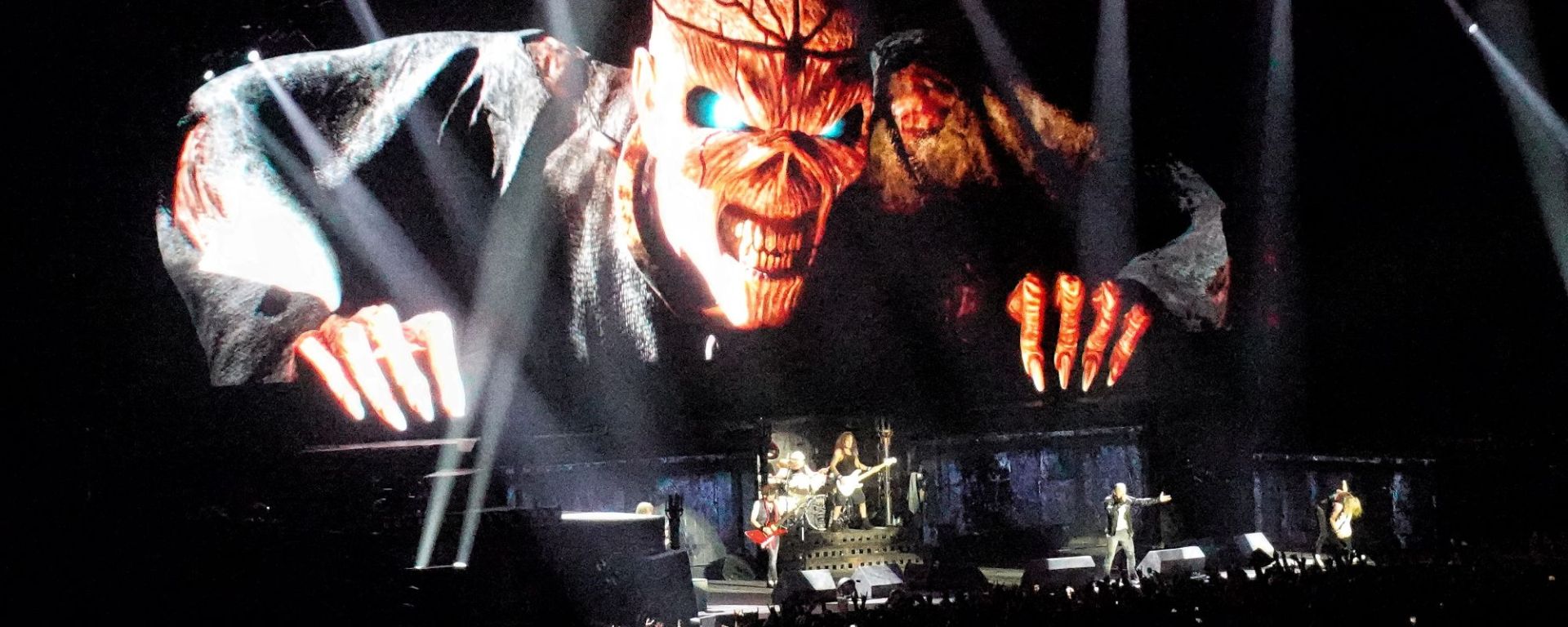 Great frenzy when the song Iron Maiden resounds. Janick Gers spins his guitar, and the giant screens reveal a hyper angry 3D Eddie who seems to come out of the screen and who ends up disconnecting the cables and making sparks!