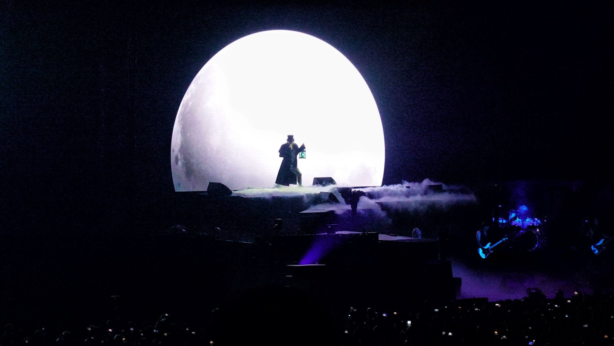 For the magical and dark Fear of the Dark taken up in chorus by THE ENTIRE room, Bruce will put on his Victorian costume and the lantern that accompanies it in the background of the full moon and haunted cemetery.