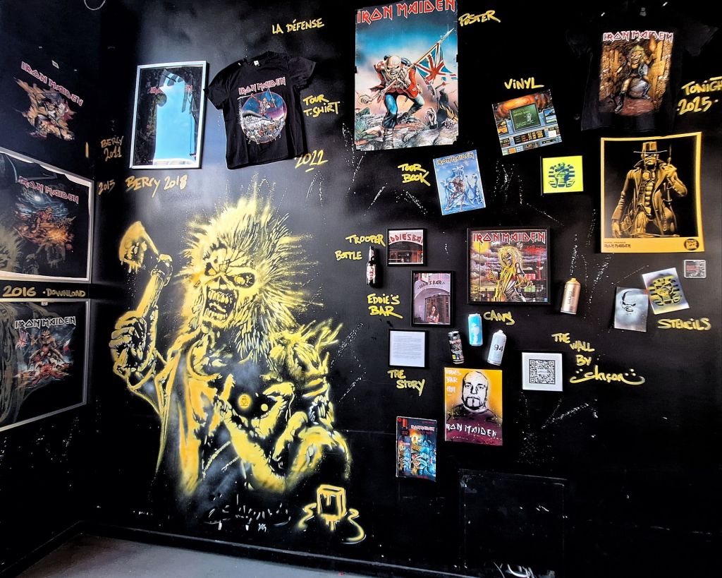 Our journey starts with a little visit to the Bar. In the middle of the skyscrapers, Eddie’s Dive Bar offered two terraces with breathtaking views of the Arc de Triomphe on one side and the Arche de la Défense on the other. The atmosphere is nice and fun! The merchandising shop is overcrowded. A huge selection of merchandise: T-shirts, backpacks, caps, patches etc are available while the bar offers many drinks including the famous Iron Maiden beer, but also pizzas named after the band’s songs. Of course, an Iron Maiden playlist was screaming loudly through the speakers, so fans could enjoy a little warm-up before going to the concert.