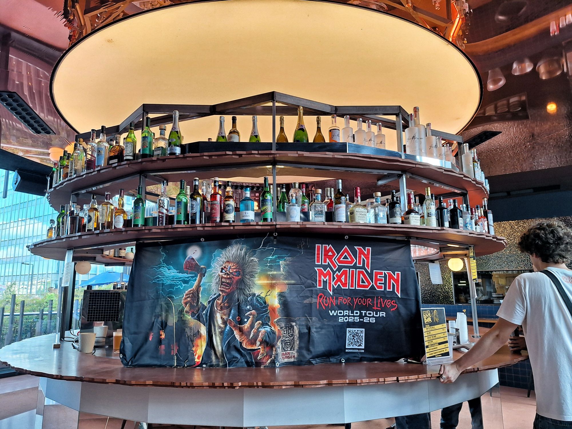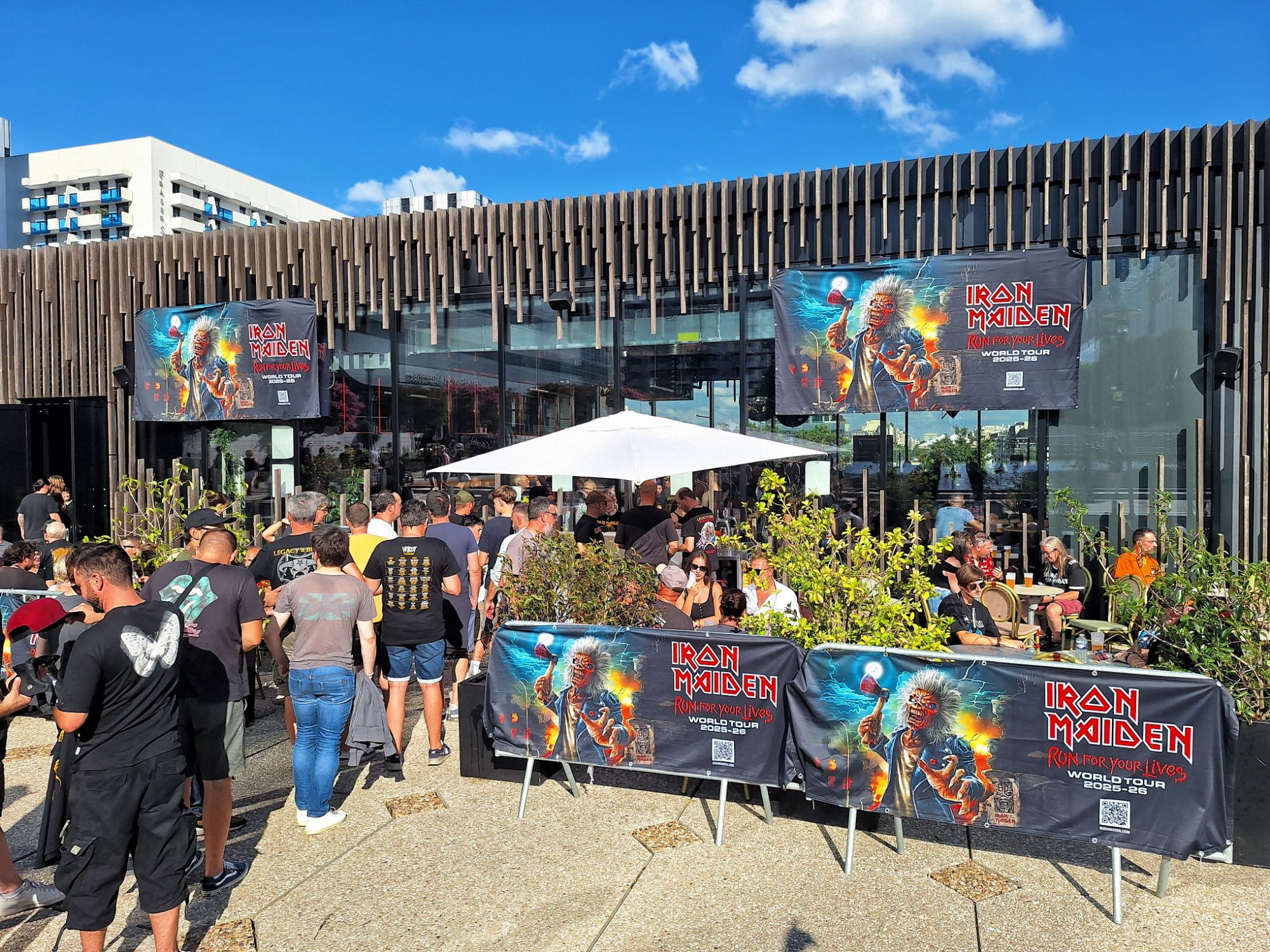 Notre périple démarre donc avec un petit passage au Bar. Au milieu des grattes ciels, le Eddie’s Dive Bar offrait deux terrasses avec vue imprenable sur l’Arc de Triomphe d’un côté et l’Arche de la Défense de l’autre. L’ambiance est Fun ! La boutique de merchandising est prise d’assaut. Une énorme sélection des produits dérivées : T-shirts, sacs à dos, casquettes, écussons etc est disponible alors que le bar offre des nombreuses boissons dont la fameuse bière Iron Maiden, mais aussi des pizzas aux noms des chansons du groupe. Evidemment, une playlist Iron Maiden hurlait à fond dans les enceintes, les fans profitant ainsi d’un petit échauffement avant d’aller au concert.