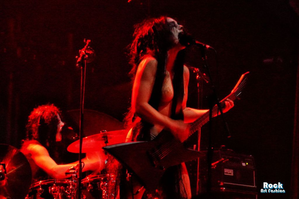 Le trio norvégien, fer de lance d’un black metal féministe et farouchement politique, plonge rapidement la salle dans un chaos musical et visuel, entre performance occulte et déflagration sonore. Nikoline Spjelkavik (guitare), Johanna Holt Kleive (batterie) et Hedda Gray Lægreid (basse) délivrent un black metal brut et dissonant, traversé d’incantations, de cris stridents et de passages a cappella glaçants, évoquant un chant spectral récité in your face!