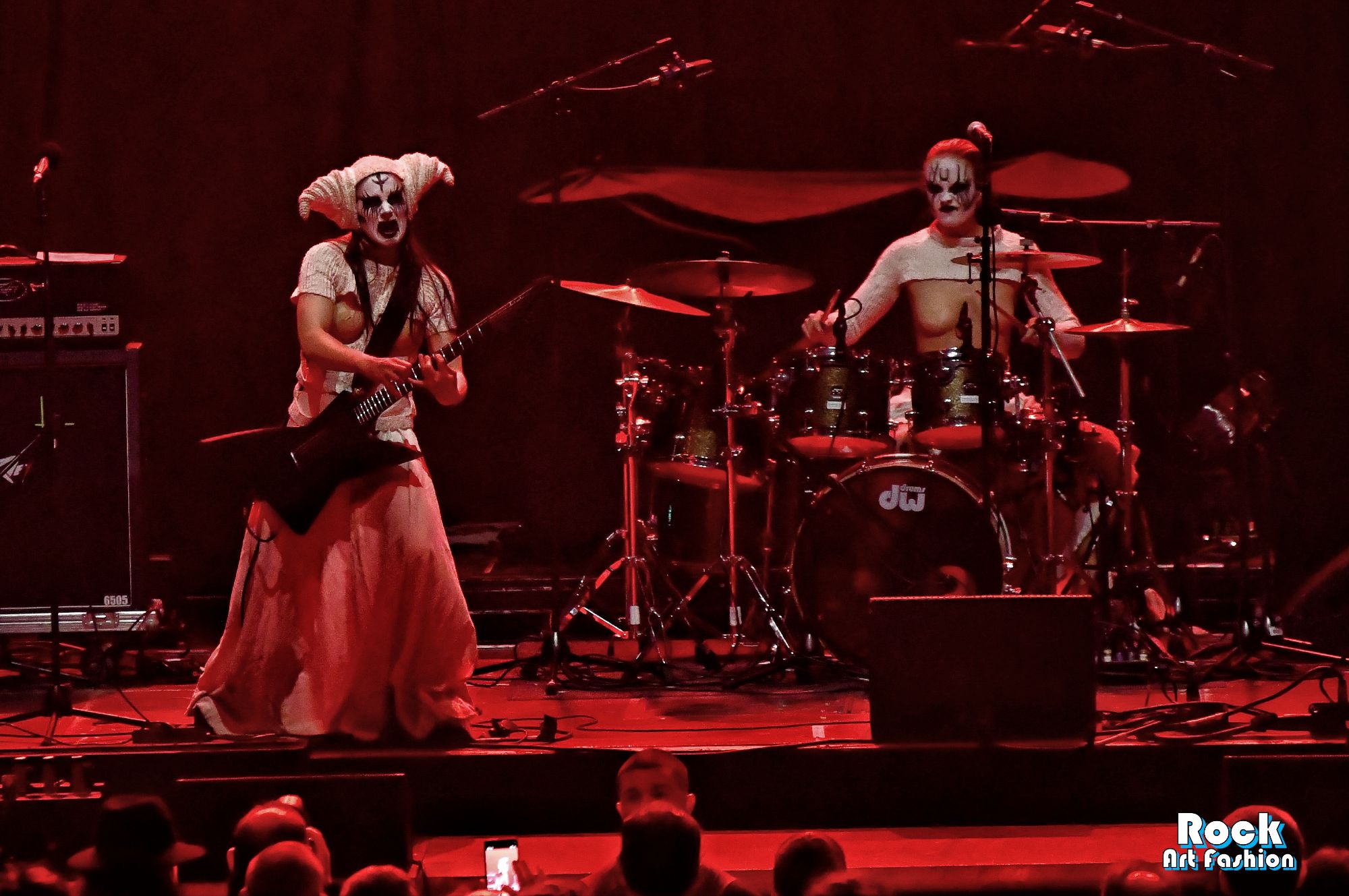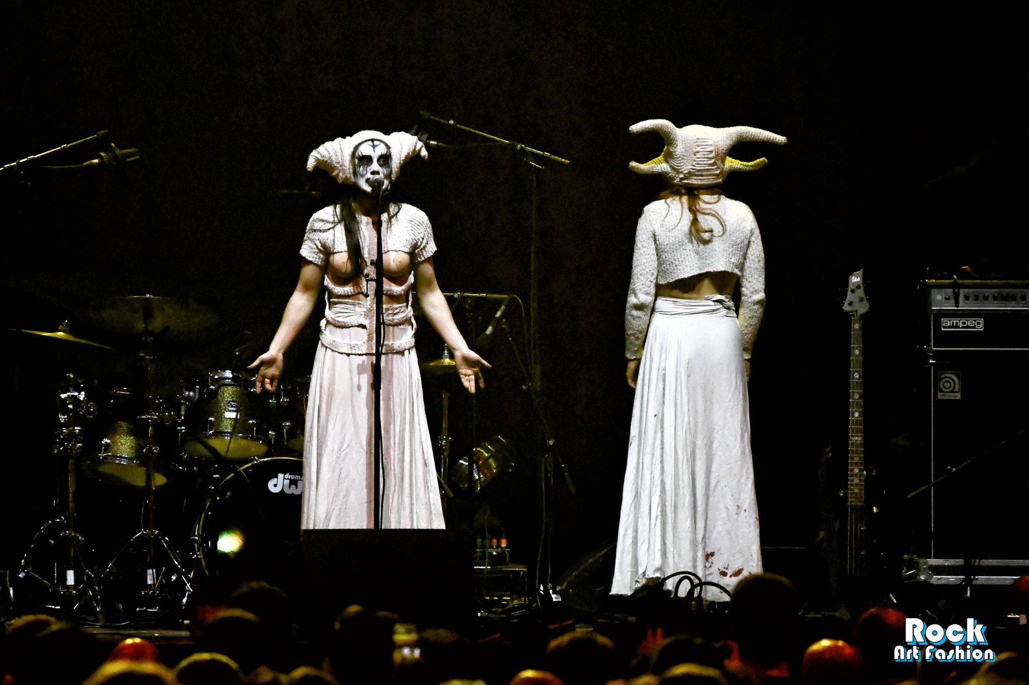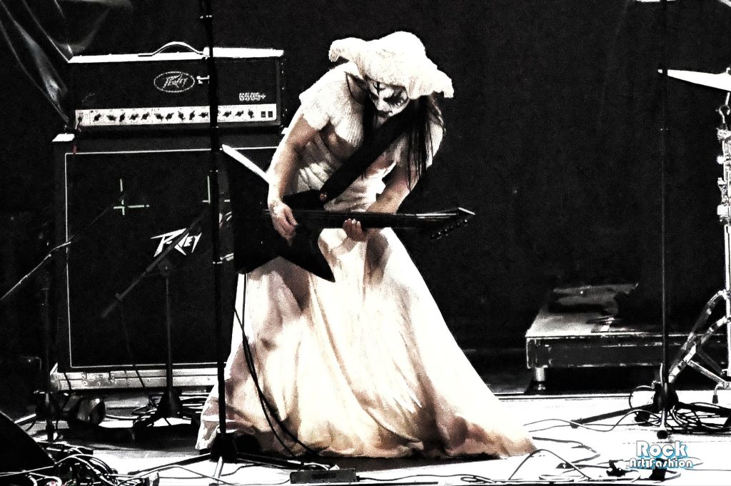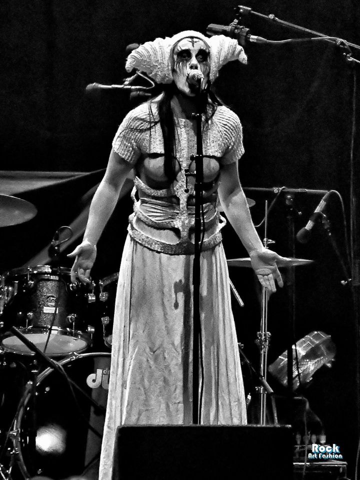Around 7 p.m., in a blood-red mist saturated with incense, the three musicians of Witch Club Satan appear in procession, painted faces, white outfits and horned headdresses and smoking sticks in their hands, as if ready to trigger a forbidden ceremony, a kind of witchcraft ritual.