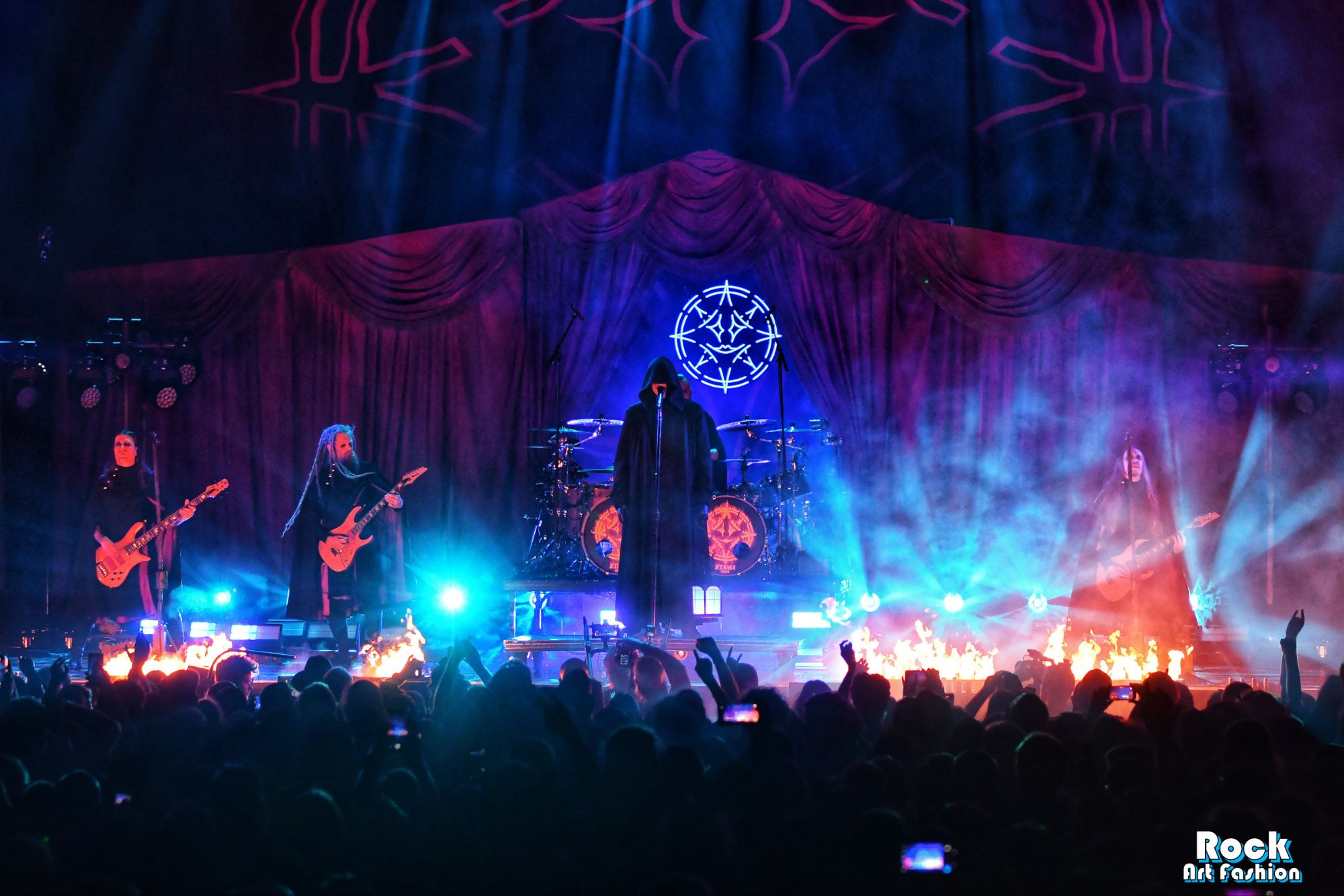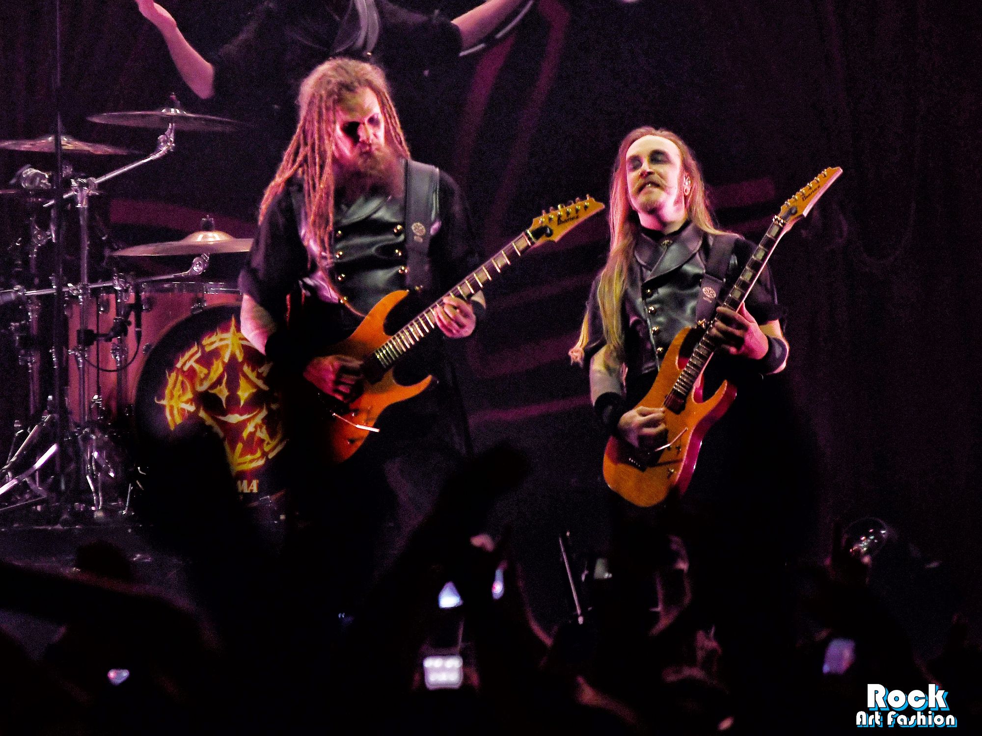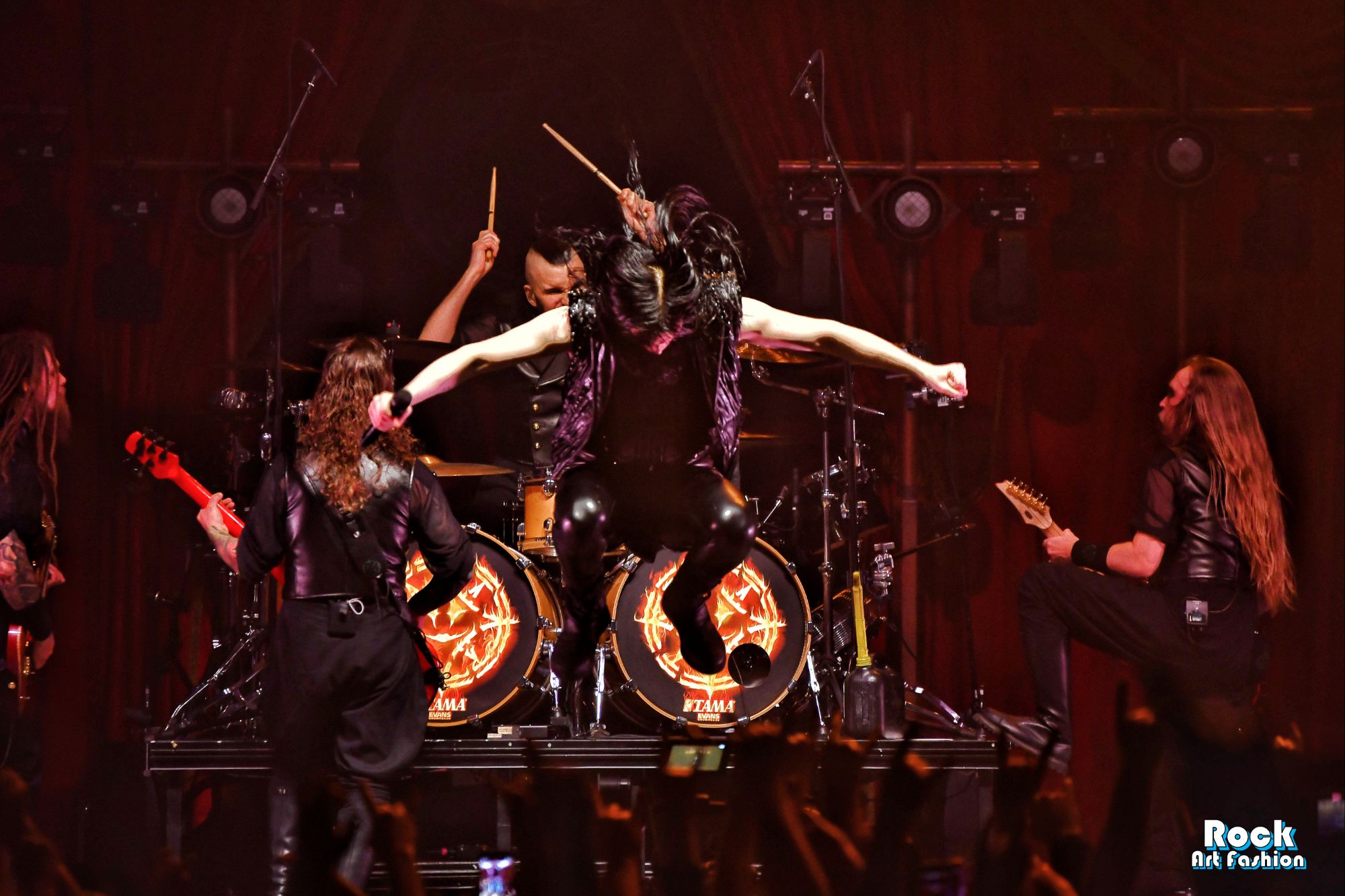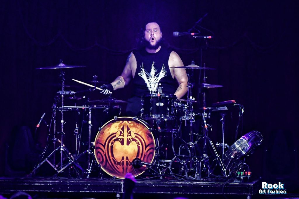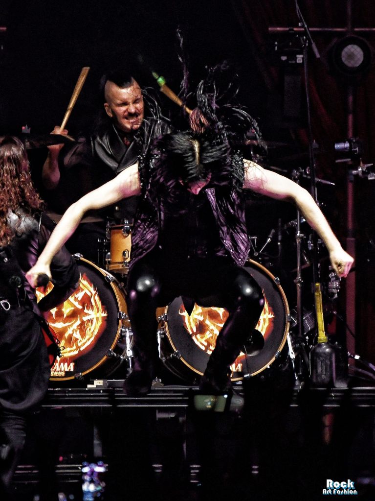 The drums open and close throughout the concert, allowing theatrical entrances. Jets of flame, coloured moving lights, Bengal fires, shadows and projections create a living scenography where each song becomes a painting. And the swirling, coordinated headbanging intensifies.