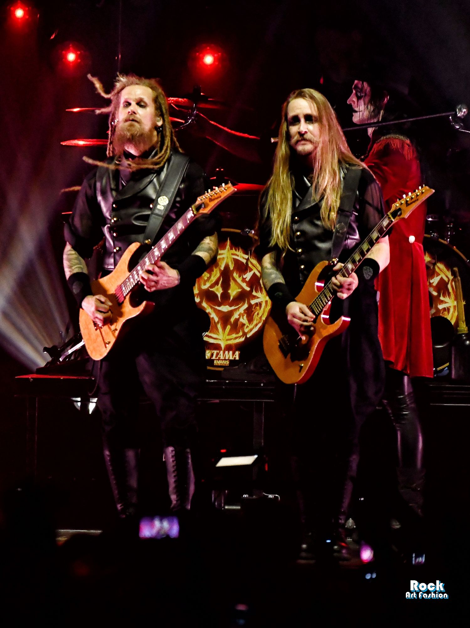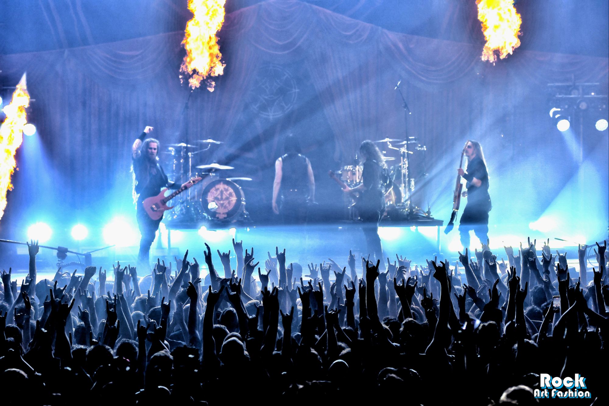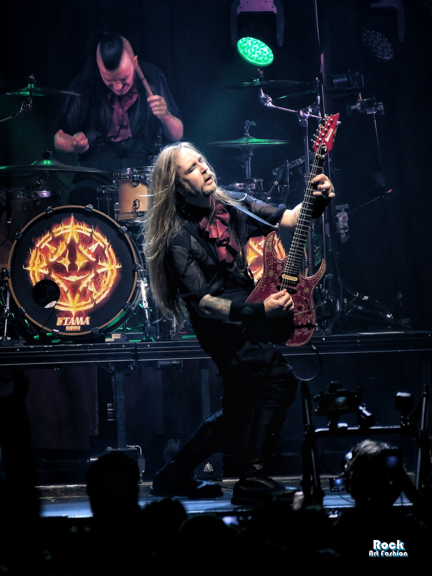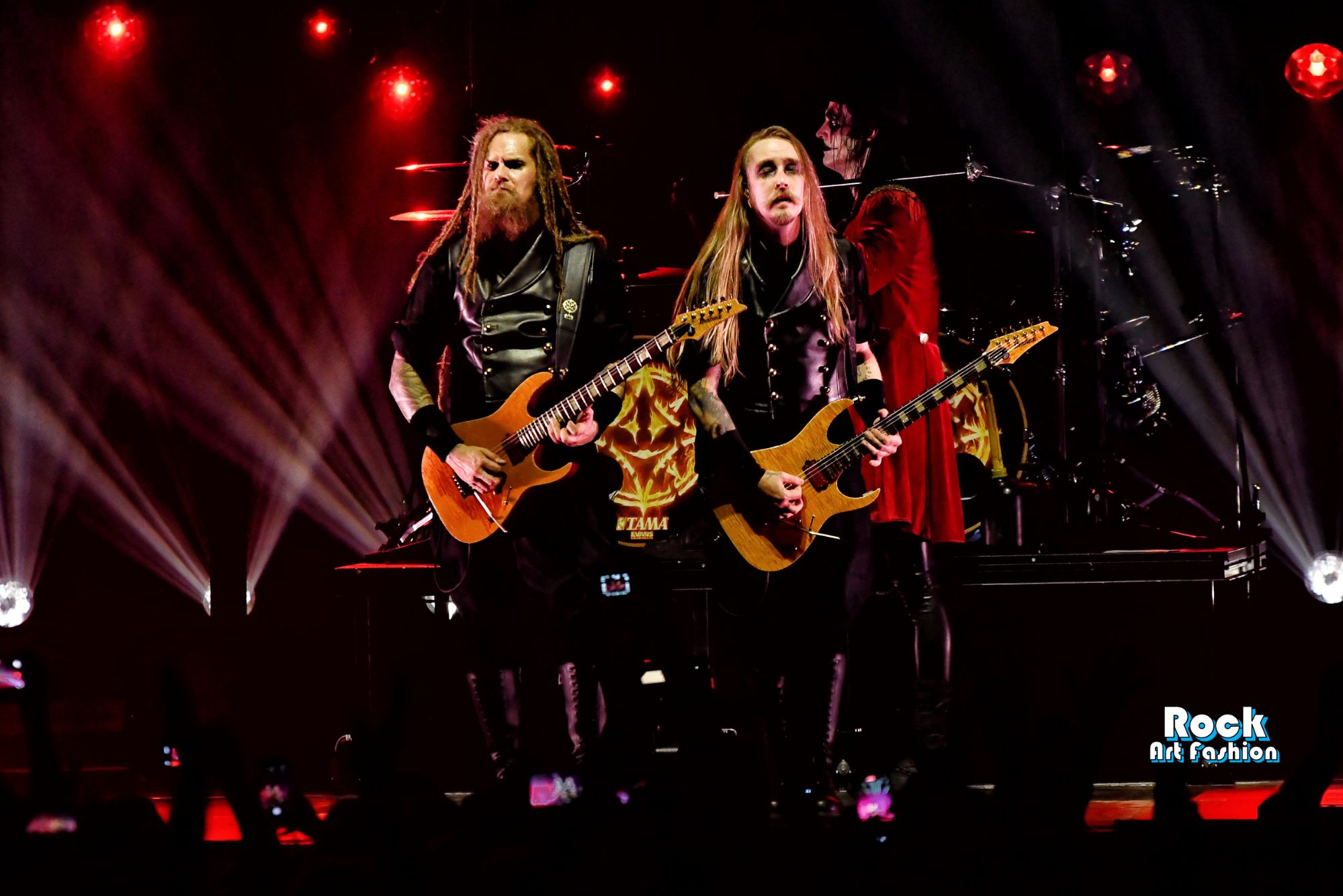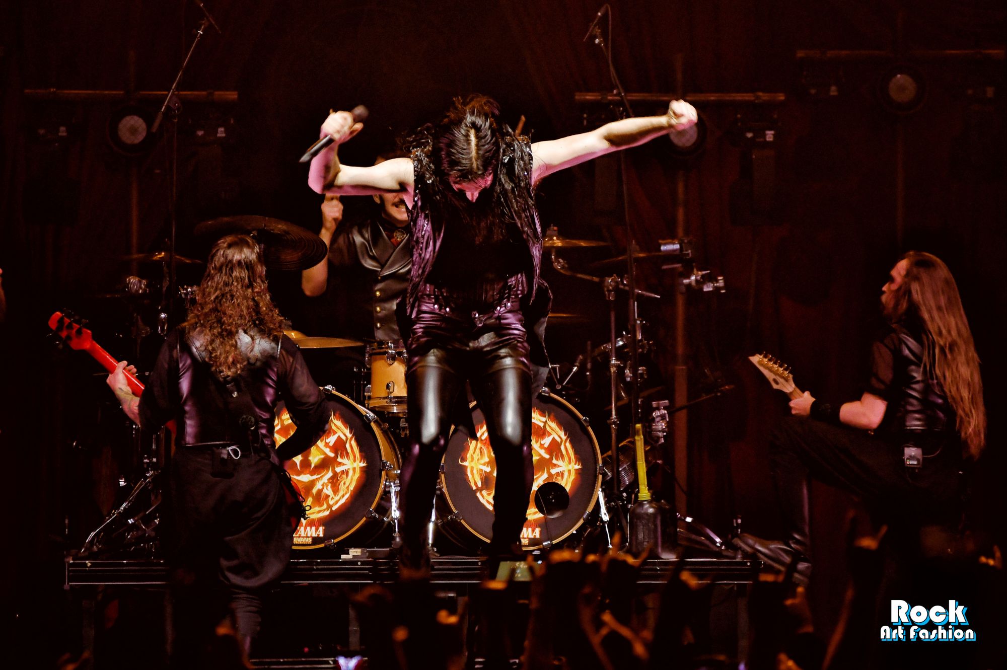 The drums open and close throughout the concert, allowing theatrical entrances. Jets of flame, coloured moving lights, Bengal fires, shadows and projections create a living scenography where each song becomes a painting. And the swirling, coordinated headbanging intensifies.