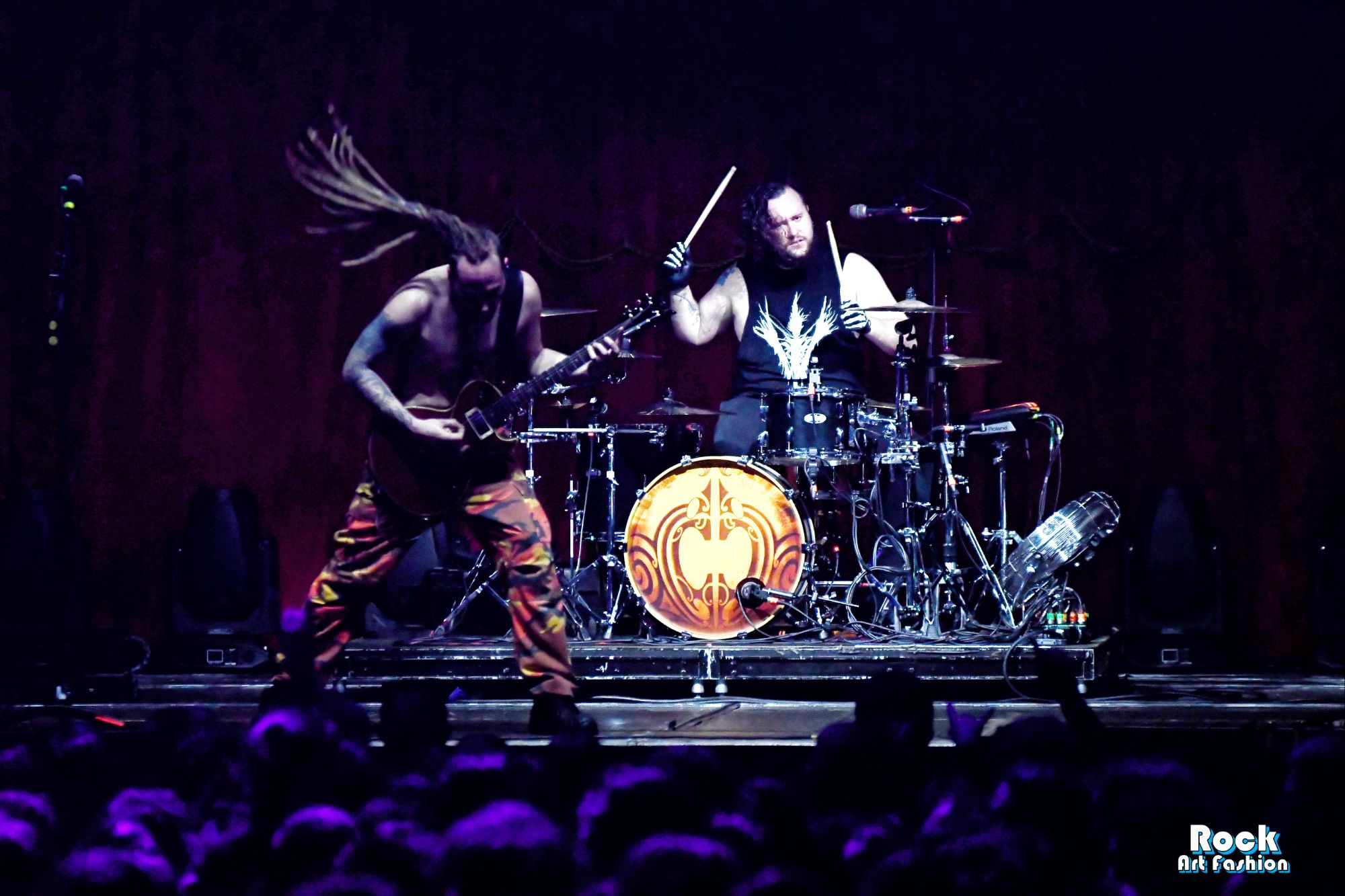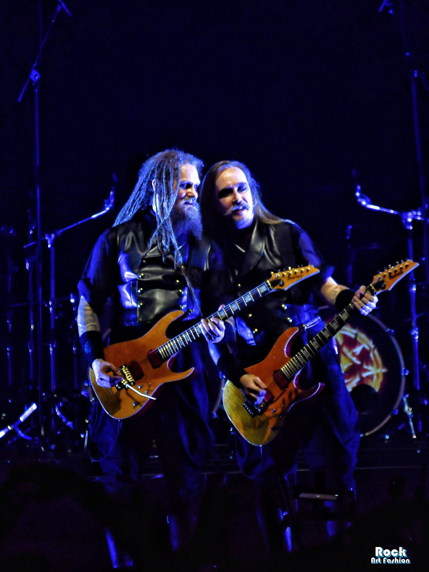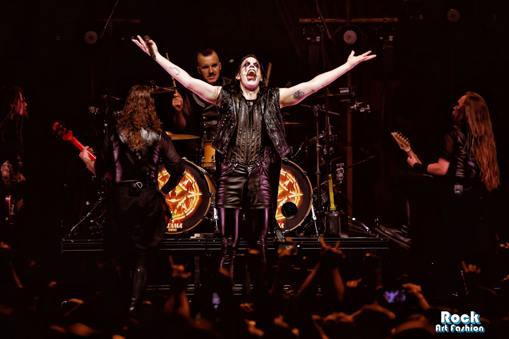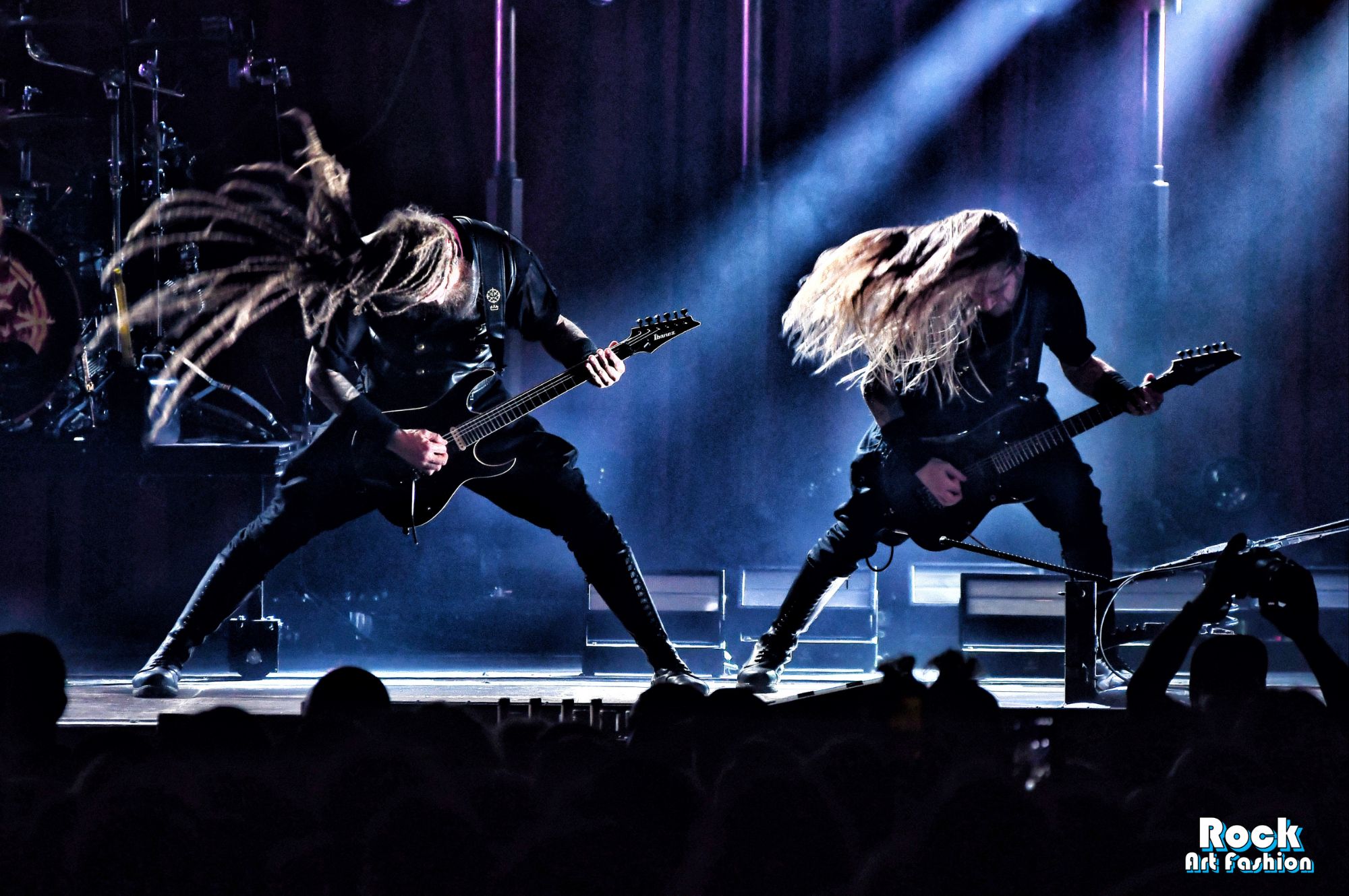 The drums open and close throughout the concert, allowing theatrical entrances. Jets of flame, coloured moving lights, Bengal fires, shadows and projections create a living scenography where each song becomes a painting. And the swirling, coordinated headbanging intensifies.