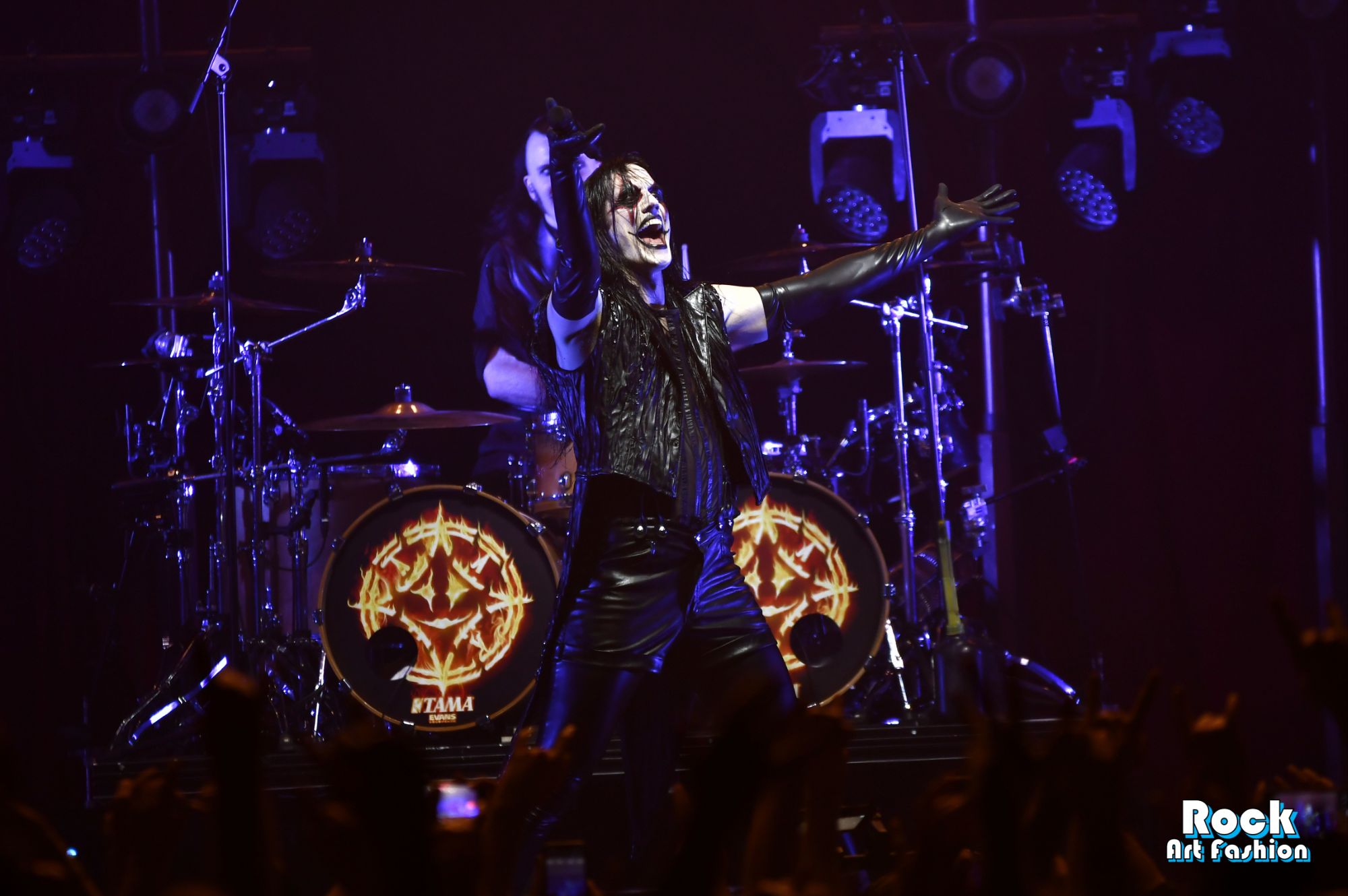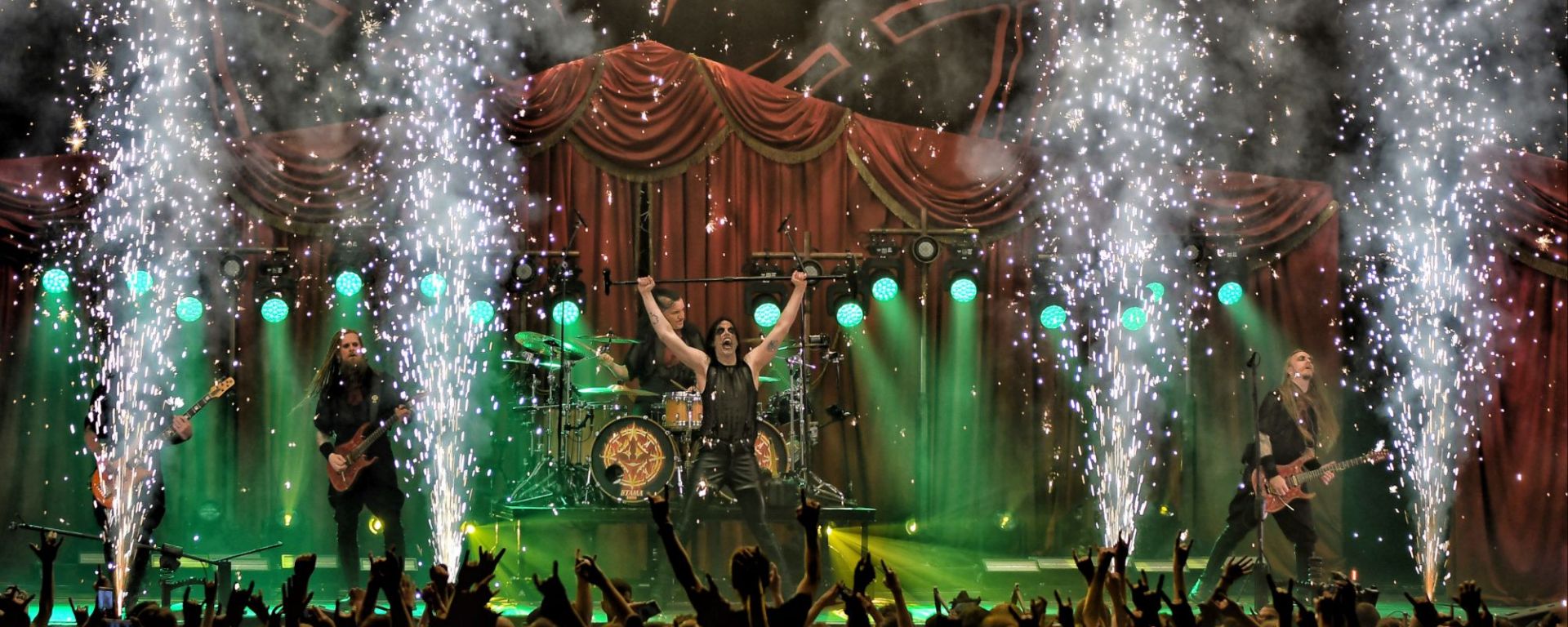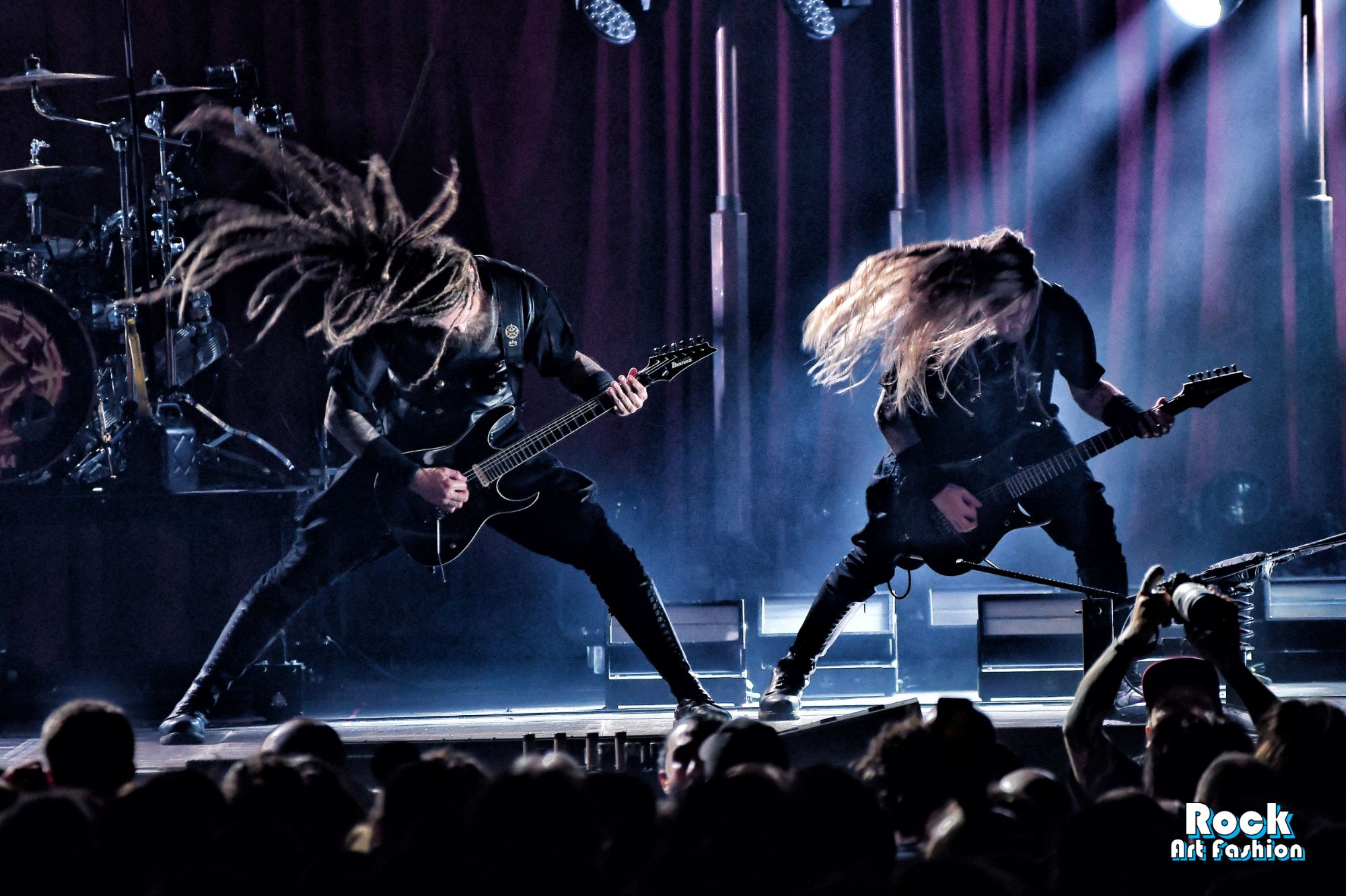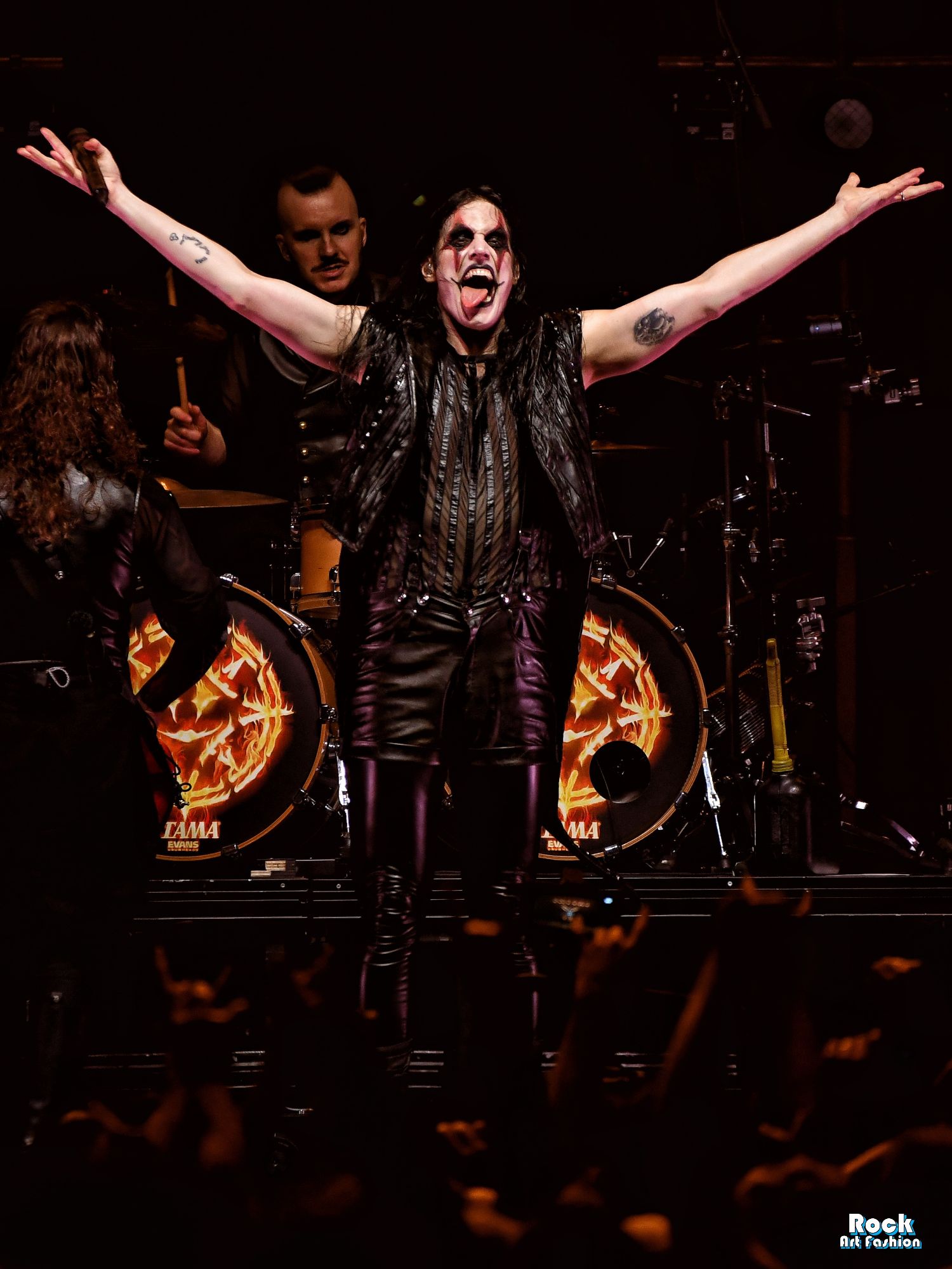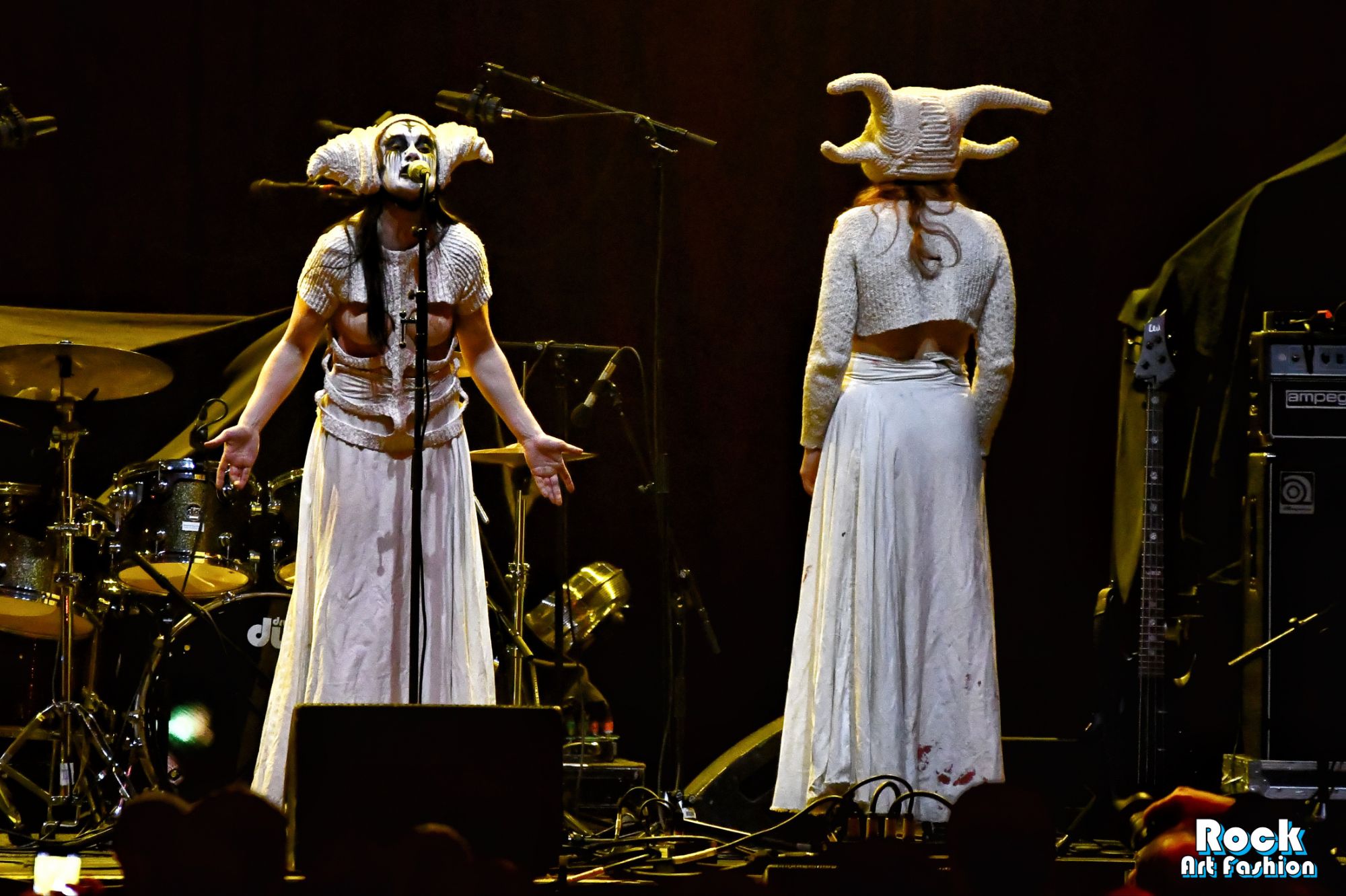 The drums open and close throughout the concert, allowing theatrical entrances. Jets of flame, coloured moving lights, Bengal fires, shadows and projections create a living scenography where each song becomes a painting. And the swirling, coordinated headbanging intensifies.