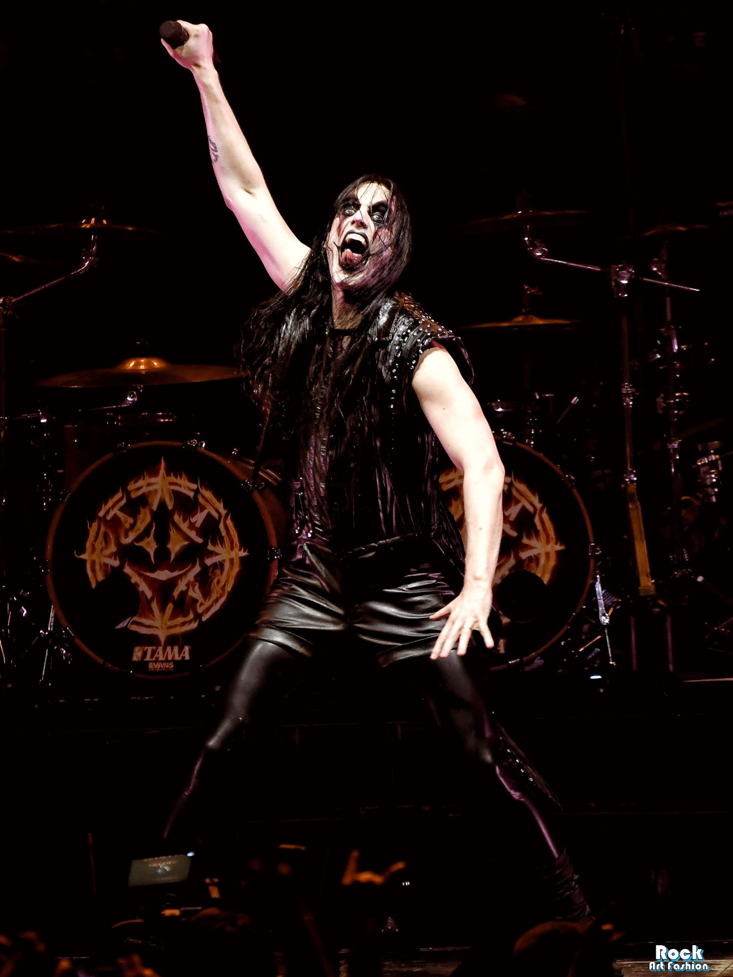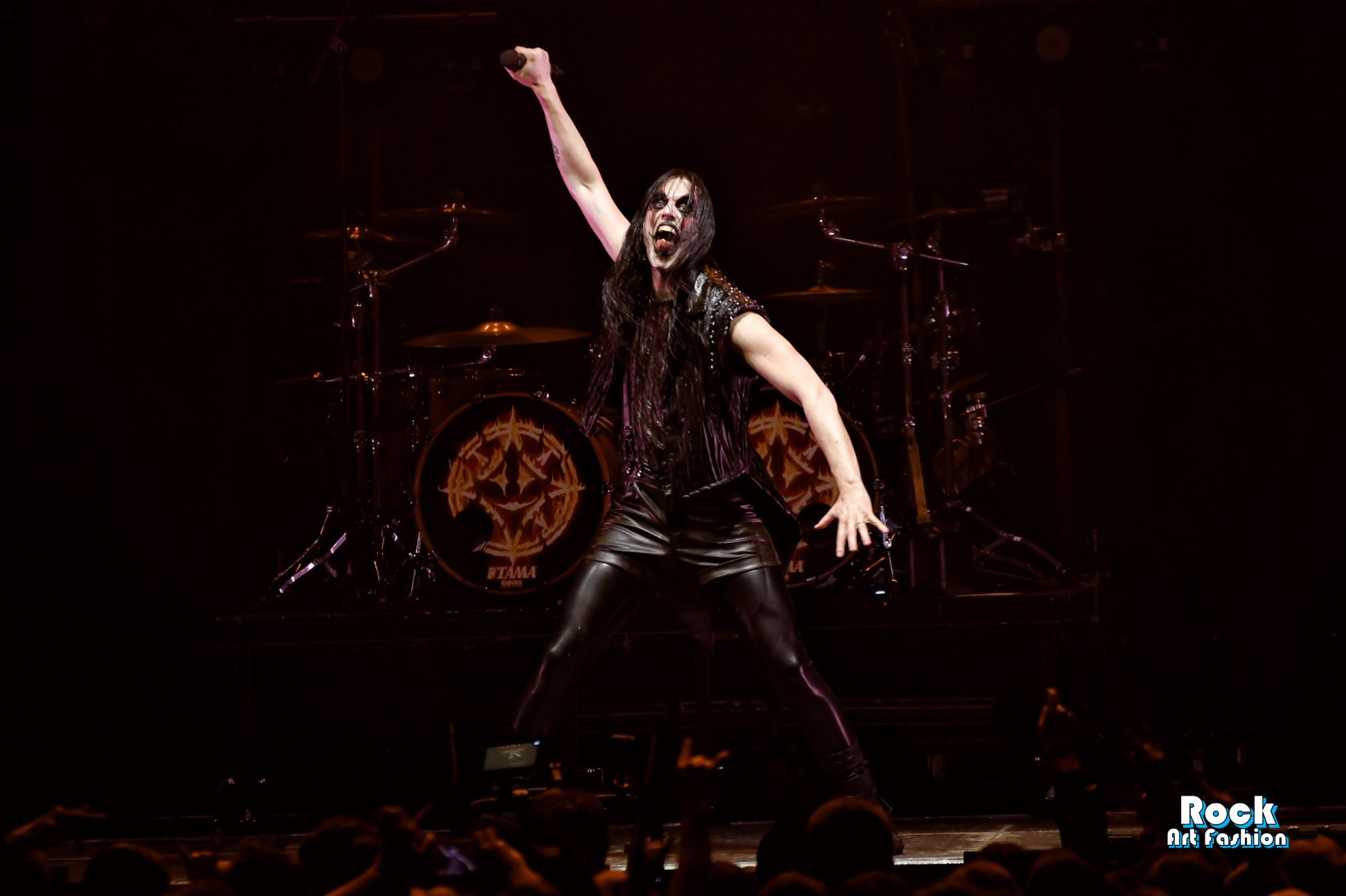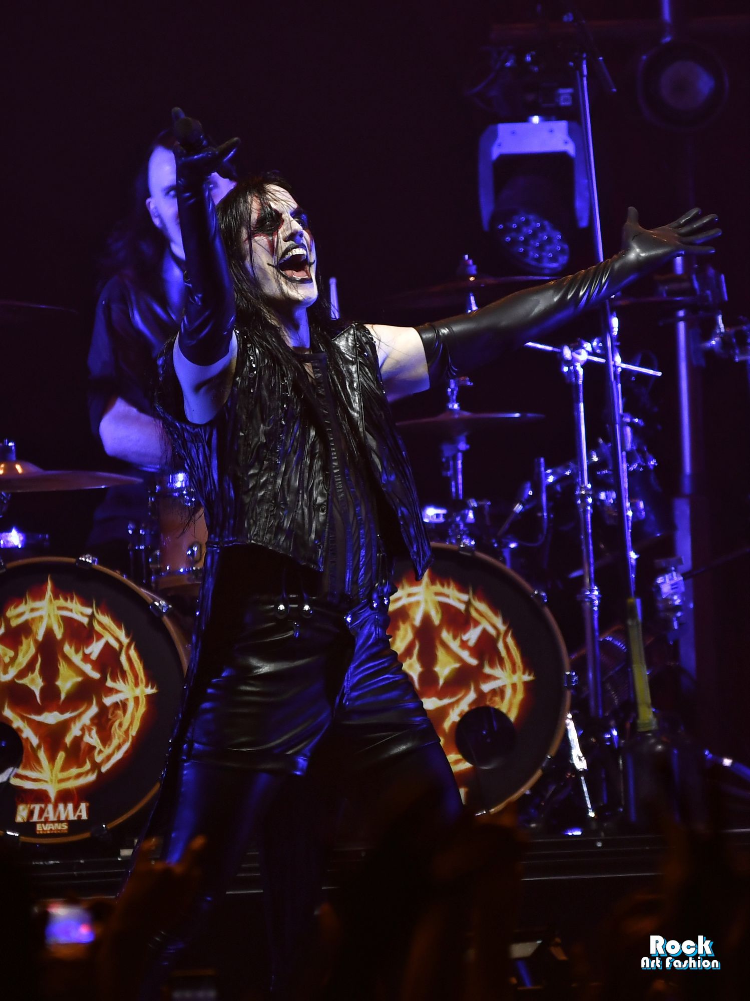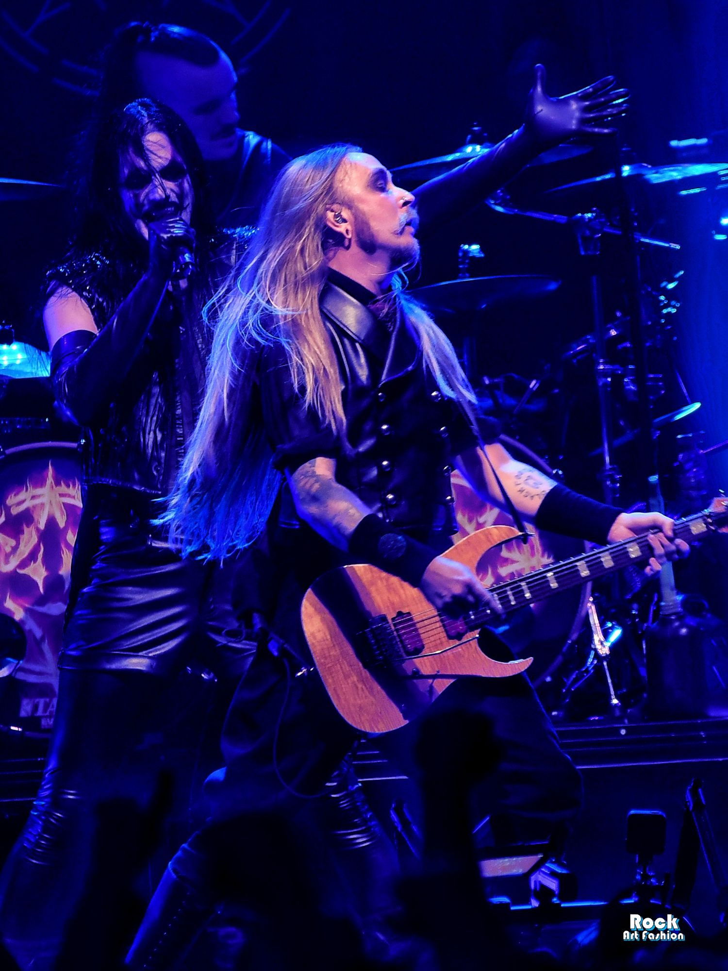 The drums open and close throughout the concert, allowing theatrical entrances. Jets of flame, coloured moving lights, Bengal fires, shadows and projections create a living scenography where each song becomes a painting. And the swirling, coordinated headbanging intensifies.