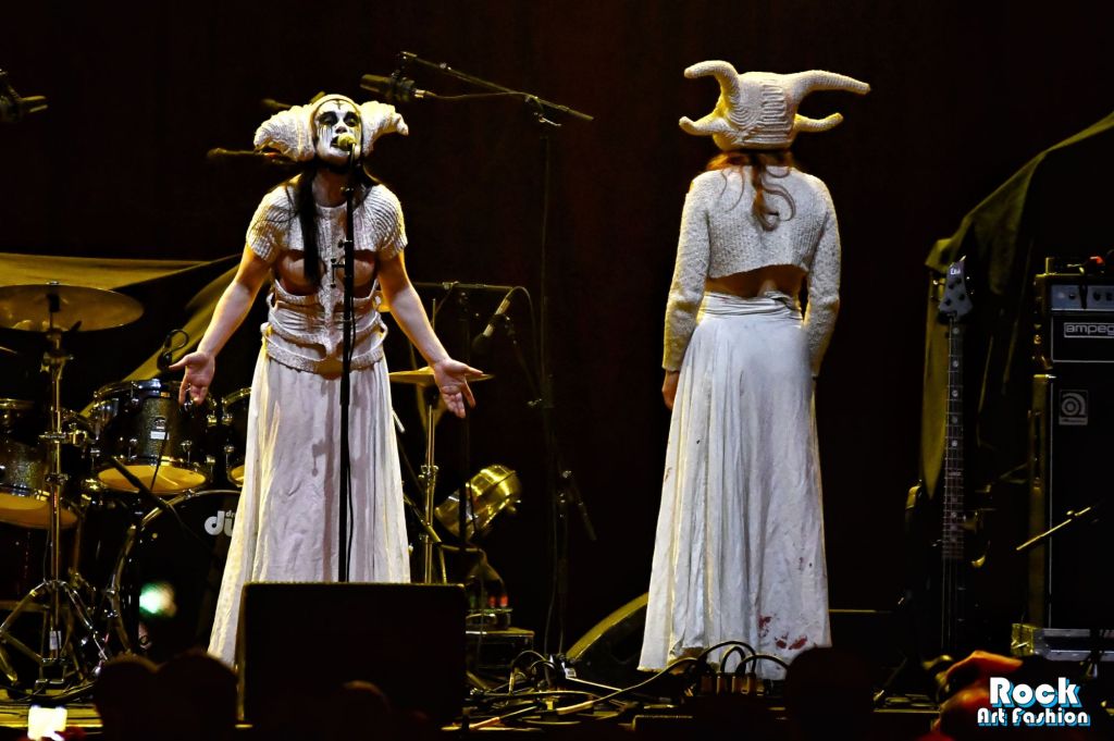 The Norwegian trio, spearhead of a feminist and fiercely political black metal, quickly plunges the room into a perfectly orchestrated chaos, between occult performance and sound explosion. Nikoline Spjelkavik (guitar), Johanna Holt Kleive (drums) and Hedda Gray Lægreid (bass) deliver a raw and dissonant black metal, crossed by incantations, shrill screams and chilling a cappella passages, evoking a spectral singing recited in the face of the audience.