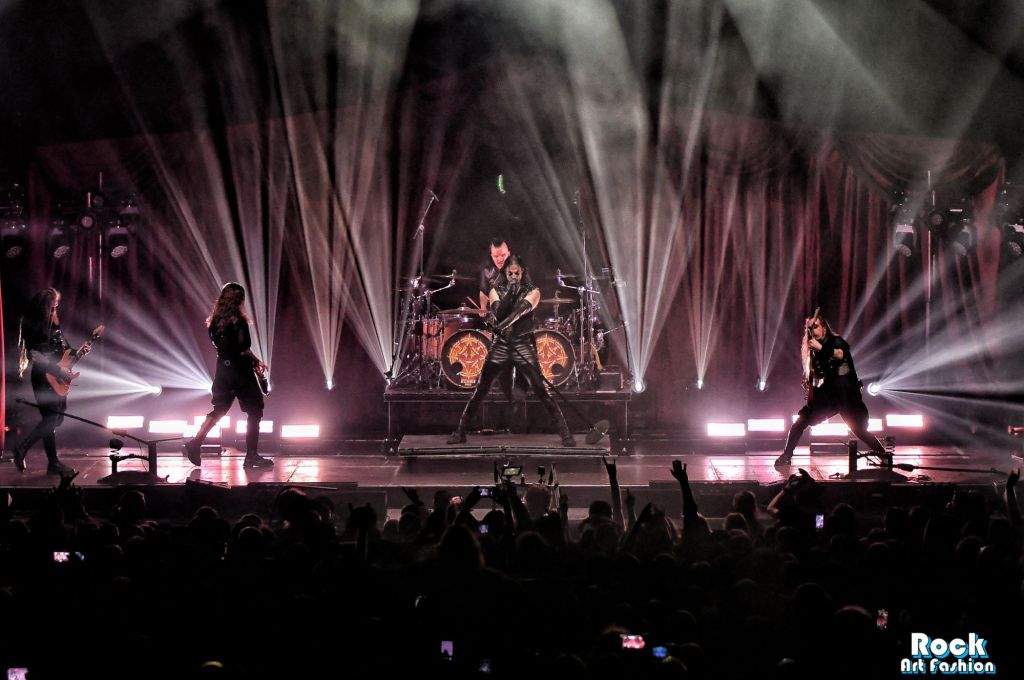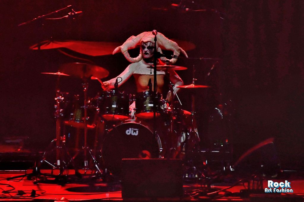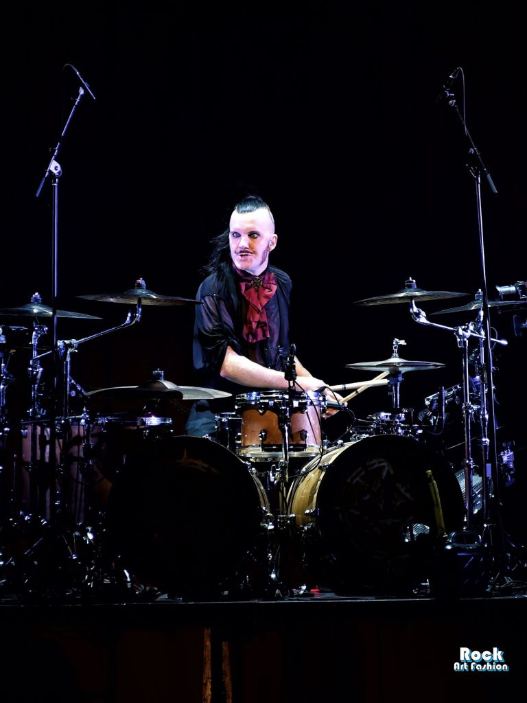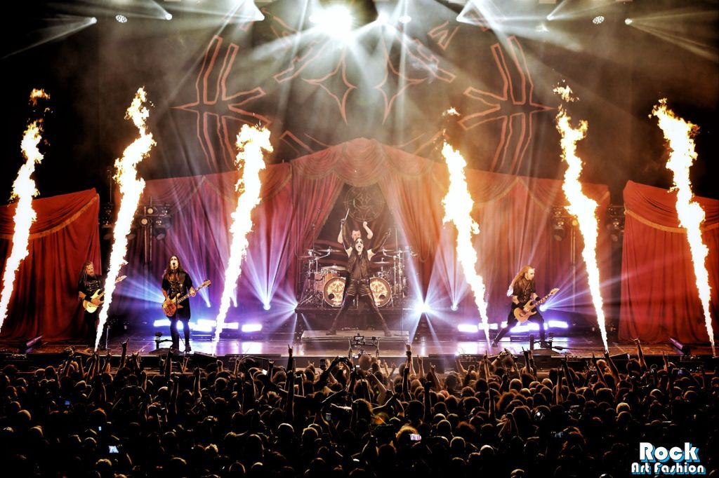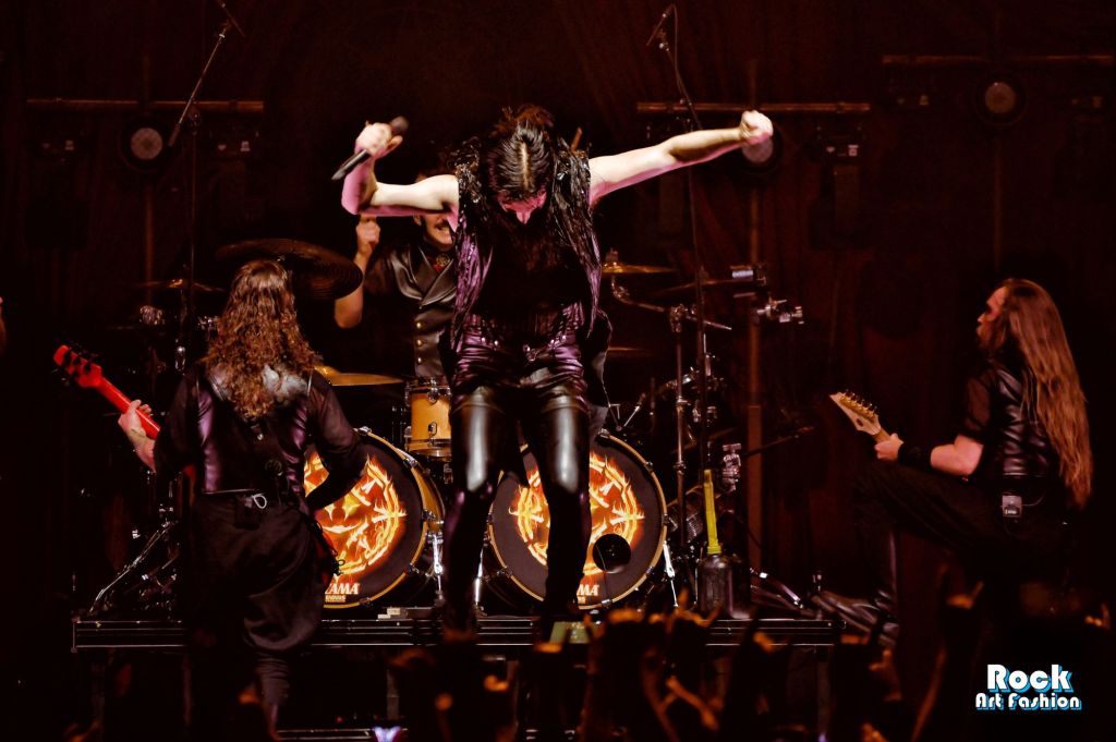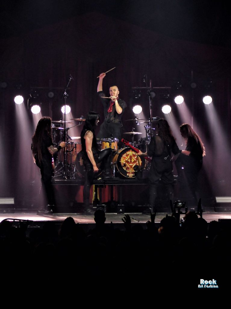 La batterie, s’ouvre et se referme tout au long du concert, permettant des entrées théâtrales. Les jets de flammes, les lumières mobiles colorées, des feux de bengale, les ombres et les projections créent une scénographie vivante où chaque chanson devient un tableau. Et les headbanging tourbillonnantes et coordonnées s’intensifient.