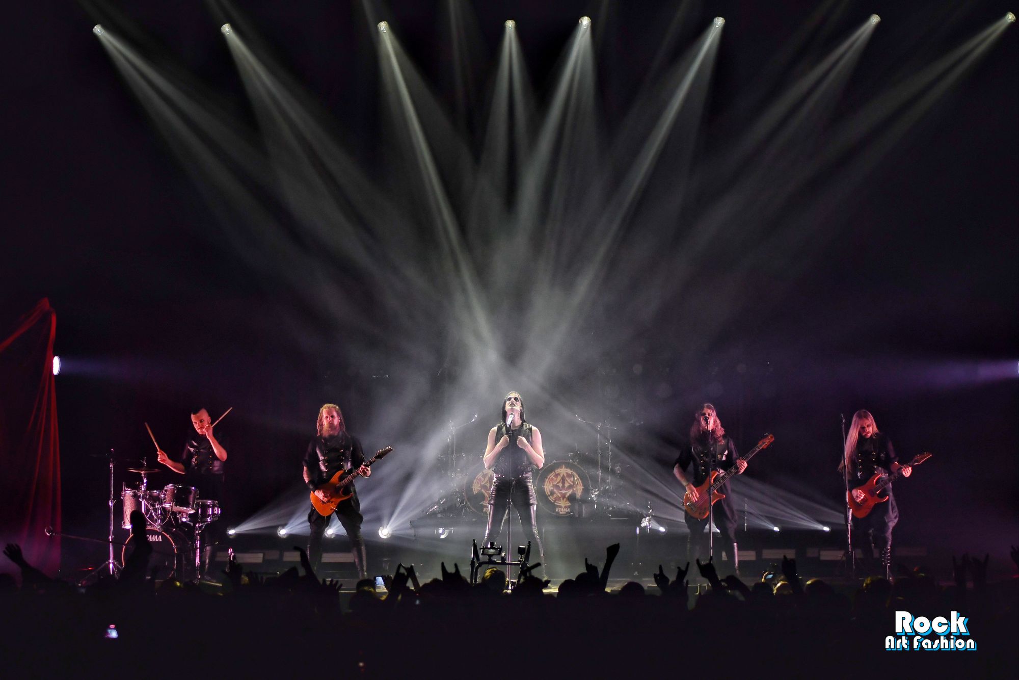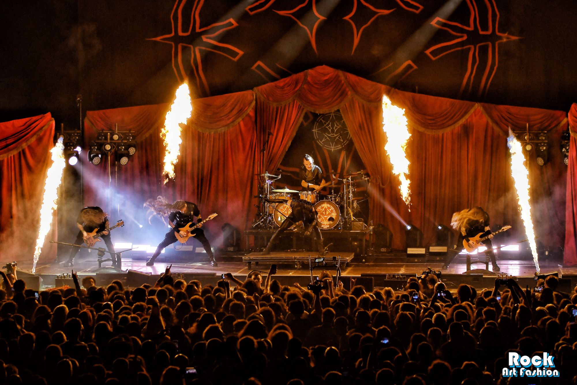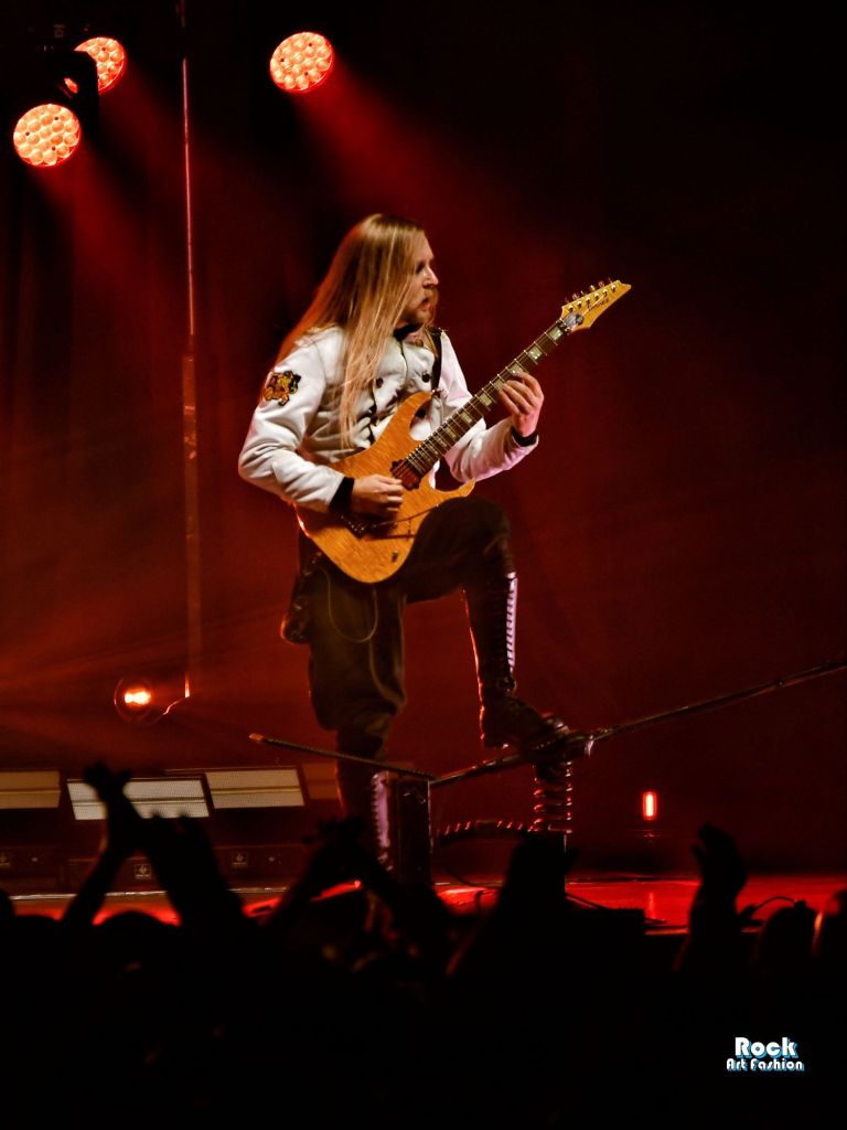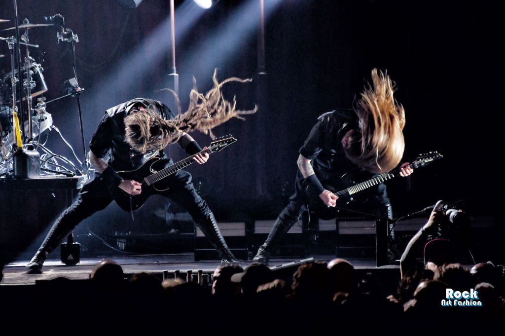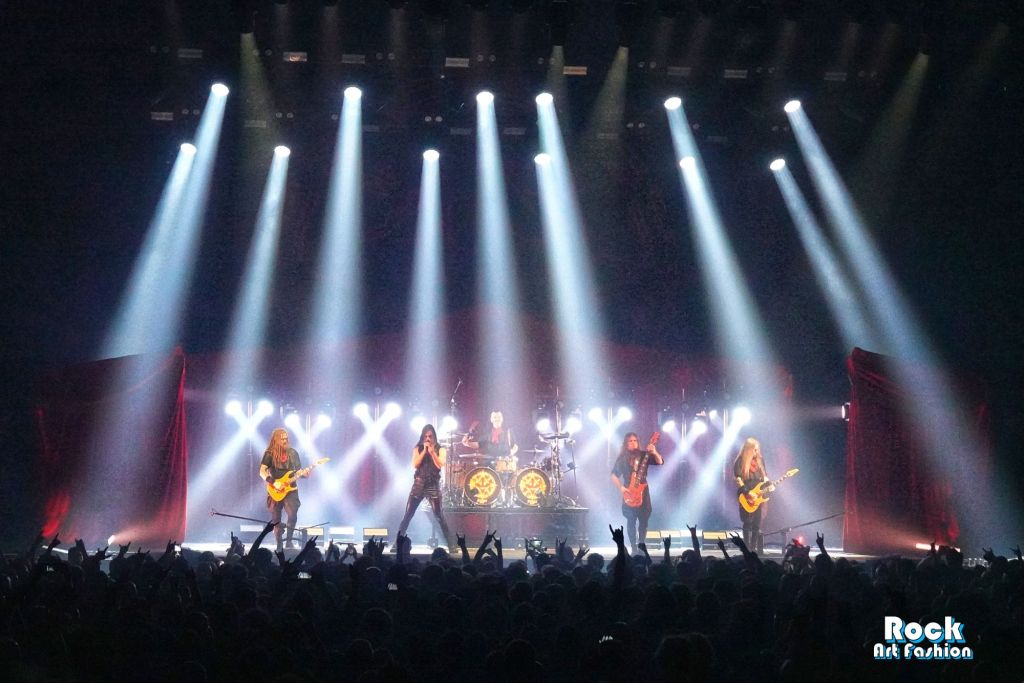 La batterie, s’ouvre et se referme tout au long du concert, permettant des entrées théâtrales. Les jets de flammes, les lumières mobiles colorées, des feux de bengale, les ombres et les projections créent une scénographie vivante où chaque chanson devient un tableau. Et les headbanging tourbillonnantes et coordonnées s’intensifient.