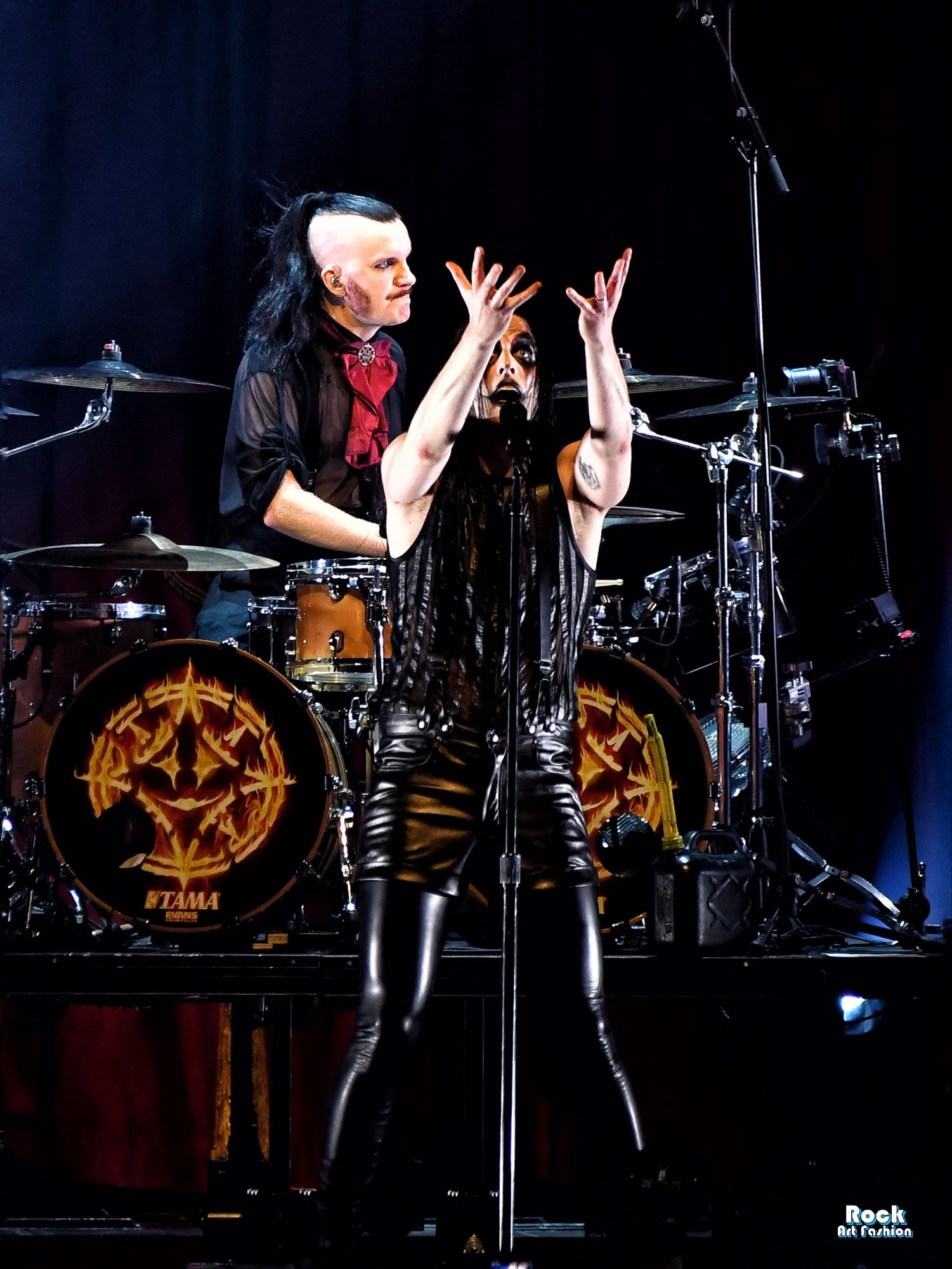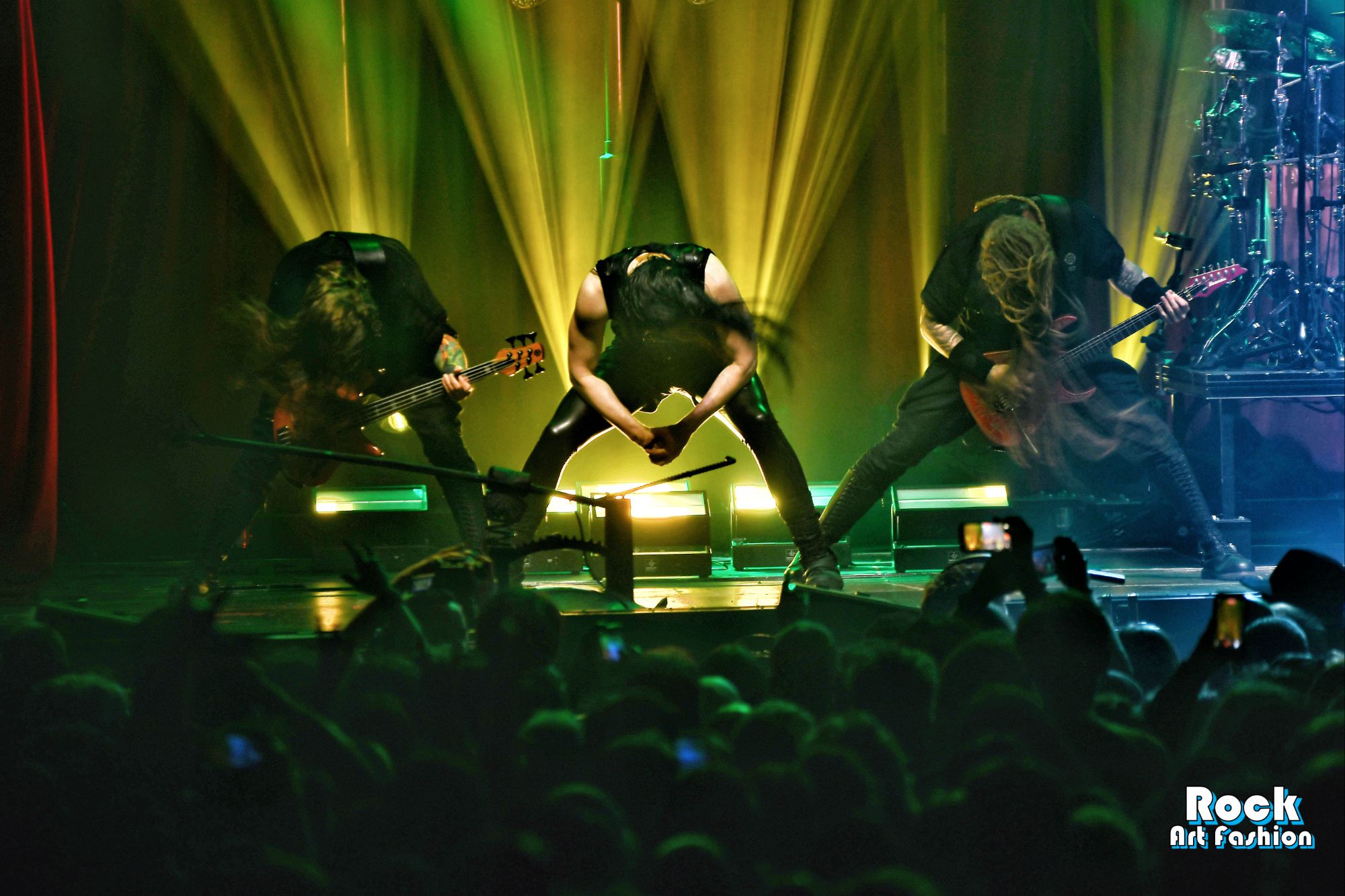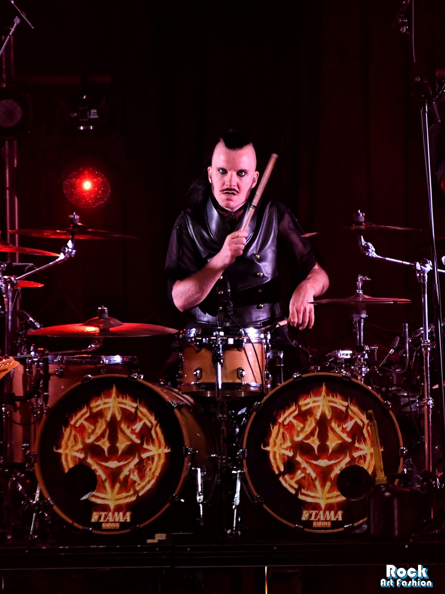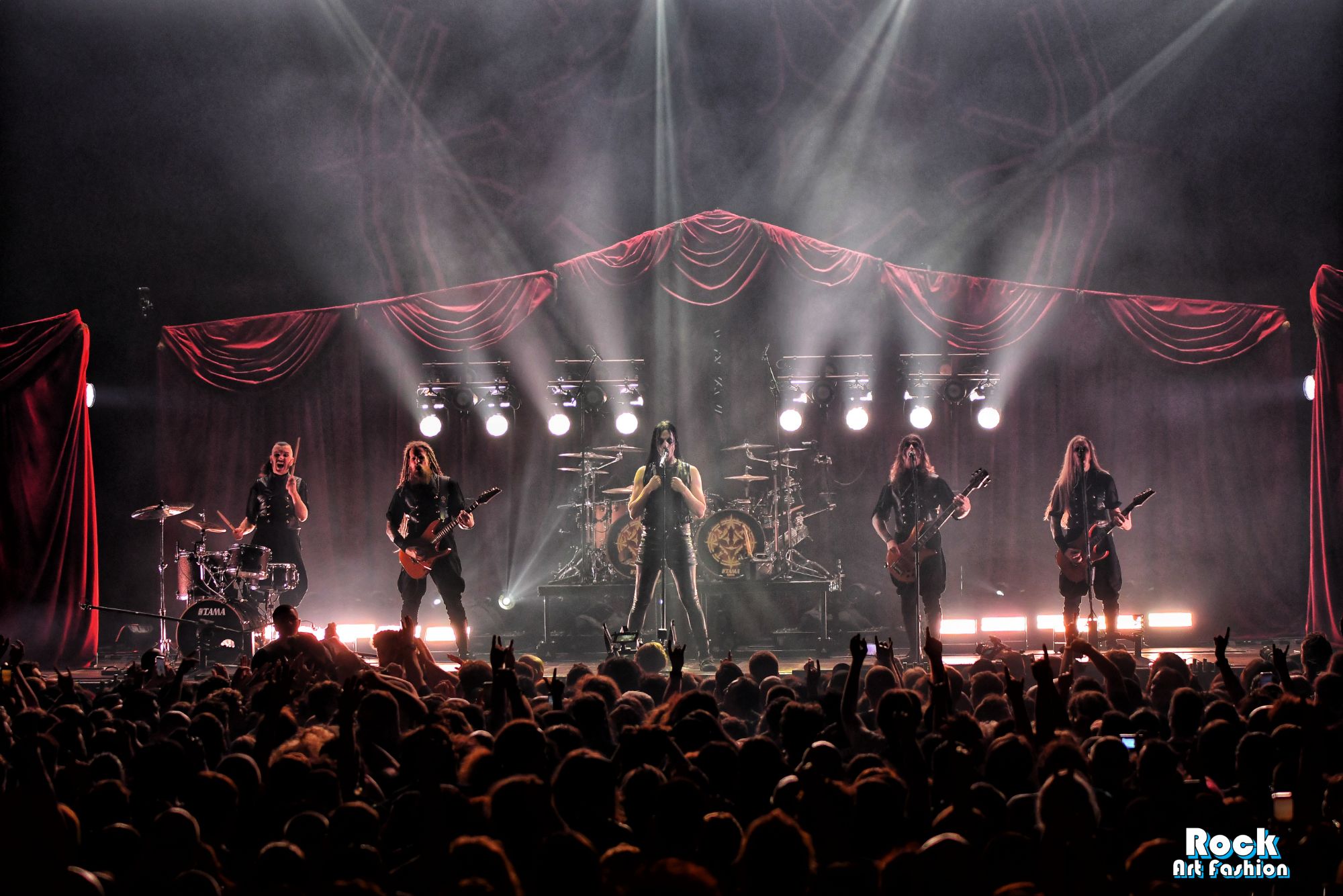 La batterie, s’ouvre et se referme tout au long du concert, permettant des entrées théâtrales. Les jets de flammes, les lumières mobiles colorées, des feux de bengale, les ombres et les projections créent une scénographie vivante où chaque chanson devient un tableau. Et les headbanging tourbillonnantes et coordonnées s’intensifient.