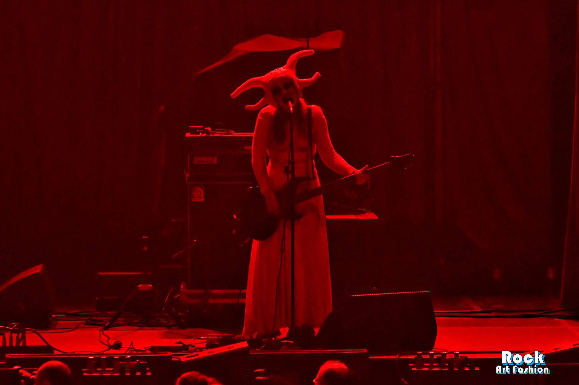 Vers 19h, dans une brume rouge sang saturée d’encens, les trois musiciennes de Witch Club Satan apparaissent en procession, visages peints, tenues et coiffes cornues blanches et bâtons fumants à la main, comme prêtes à déclencher une cérémonie interdite, une sorte de rituel de sorcellerie.