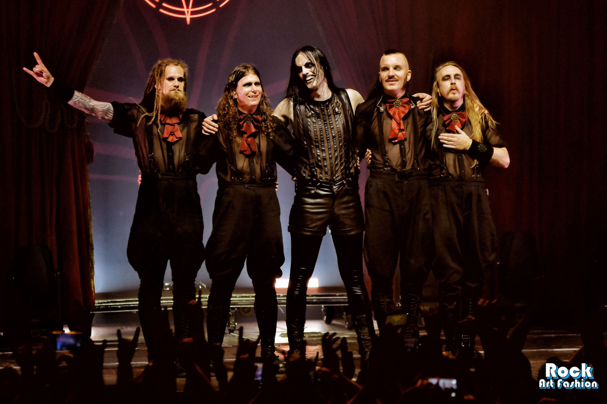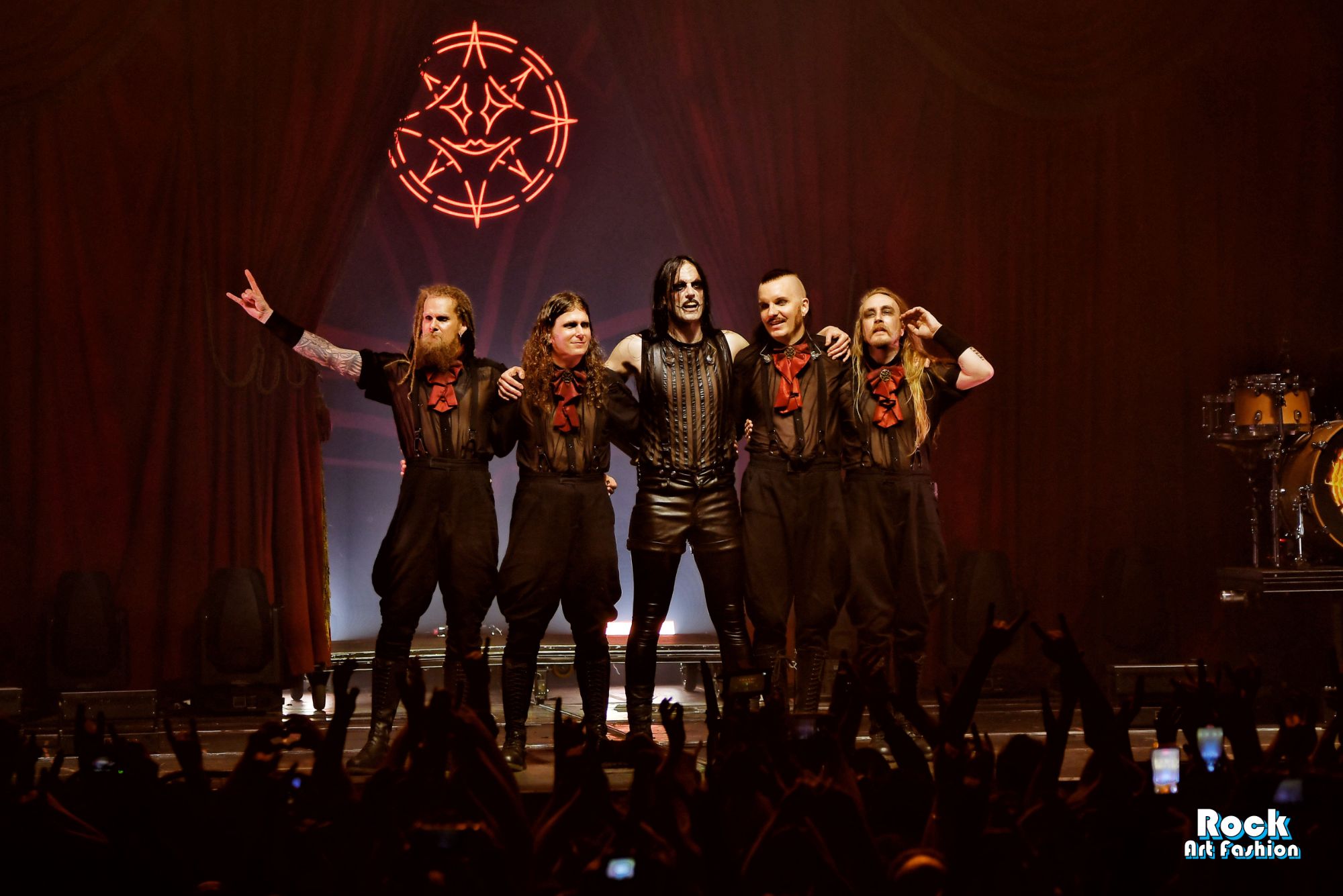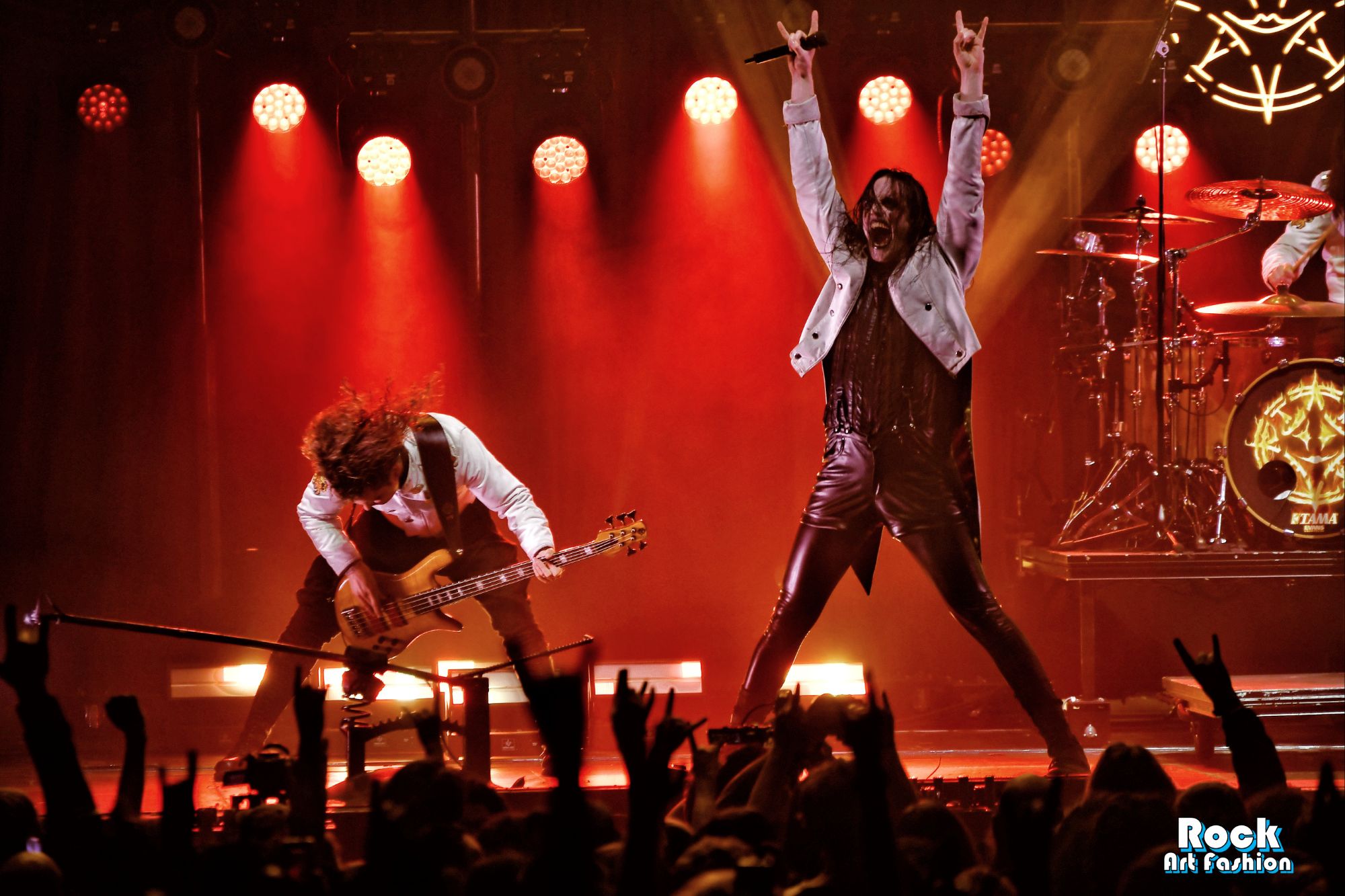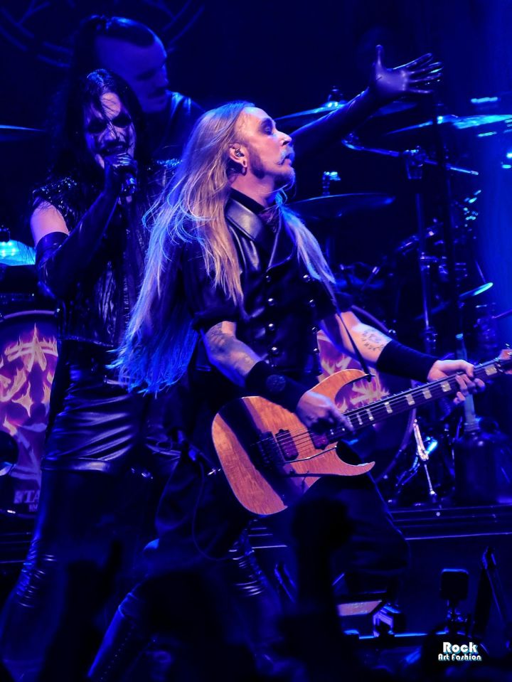 Tonight, if the band wears new clothes: shirts, vests, black pants, red jabots, except for Johannes who wears a satin black top, latex leggings and gloves, leather shorts, the old costumes parade, reminiscent of the different eras of the group: the red coat and black hat of Bloody Angel, the white military jackets of Avatar Country…