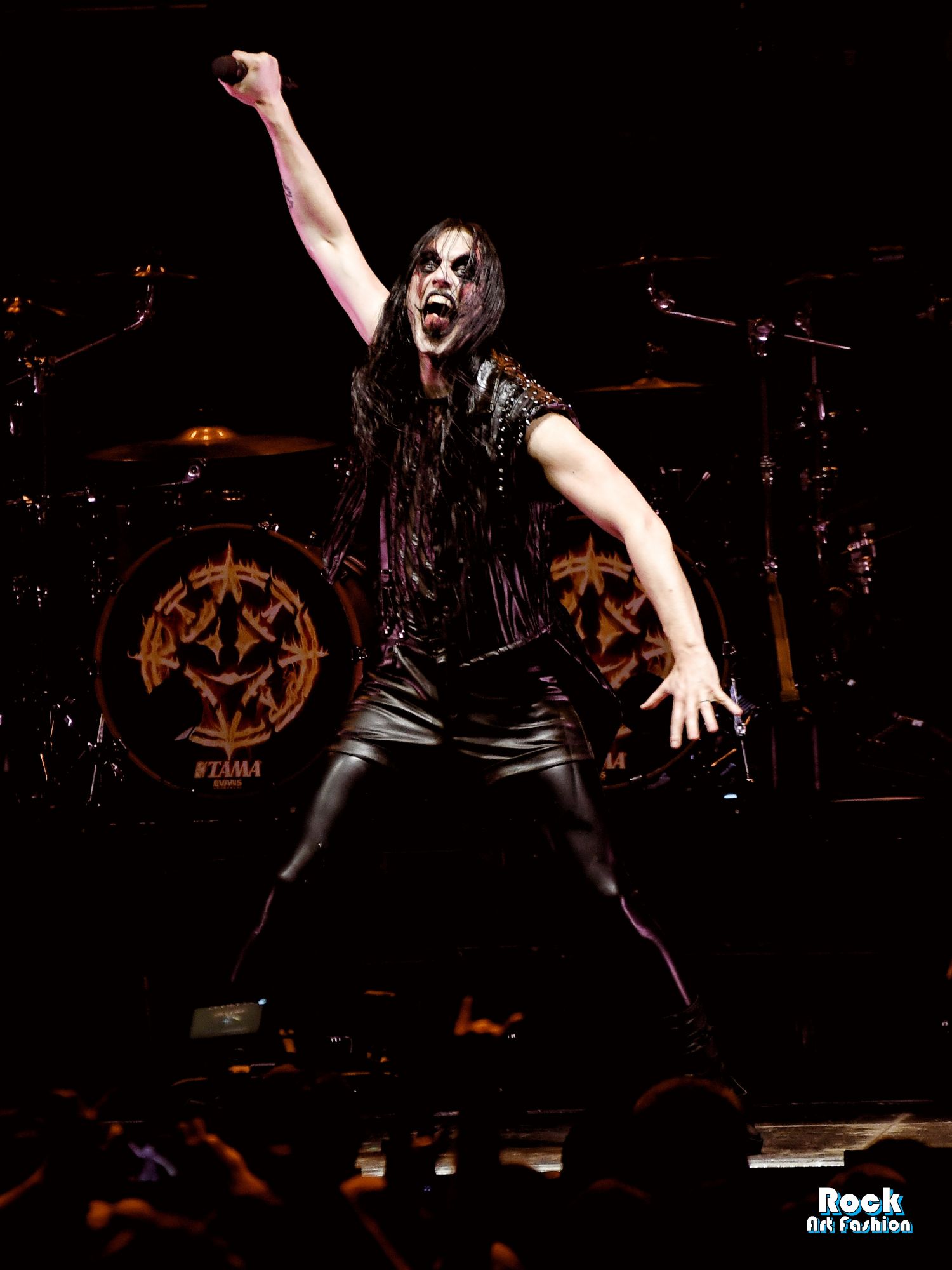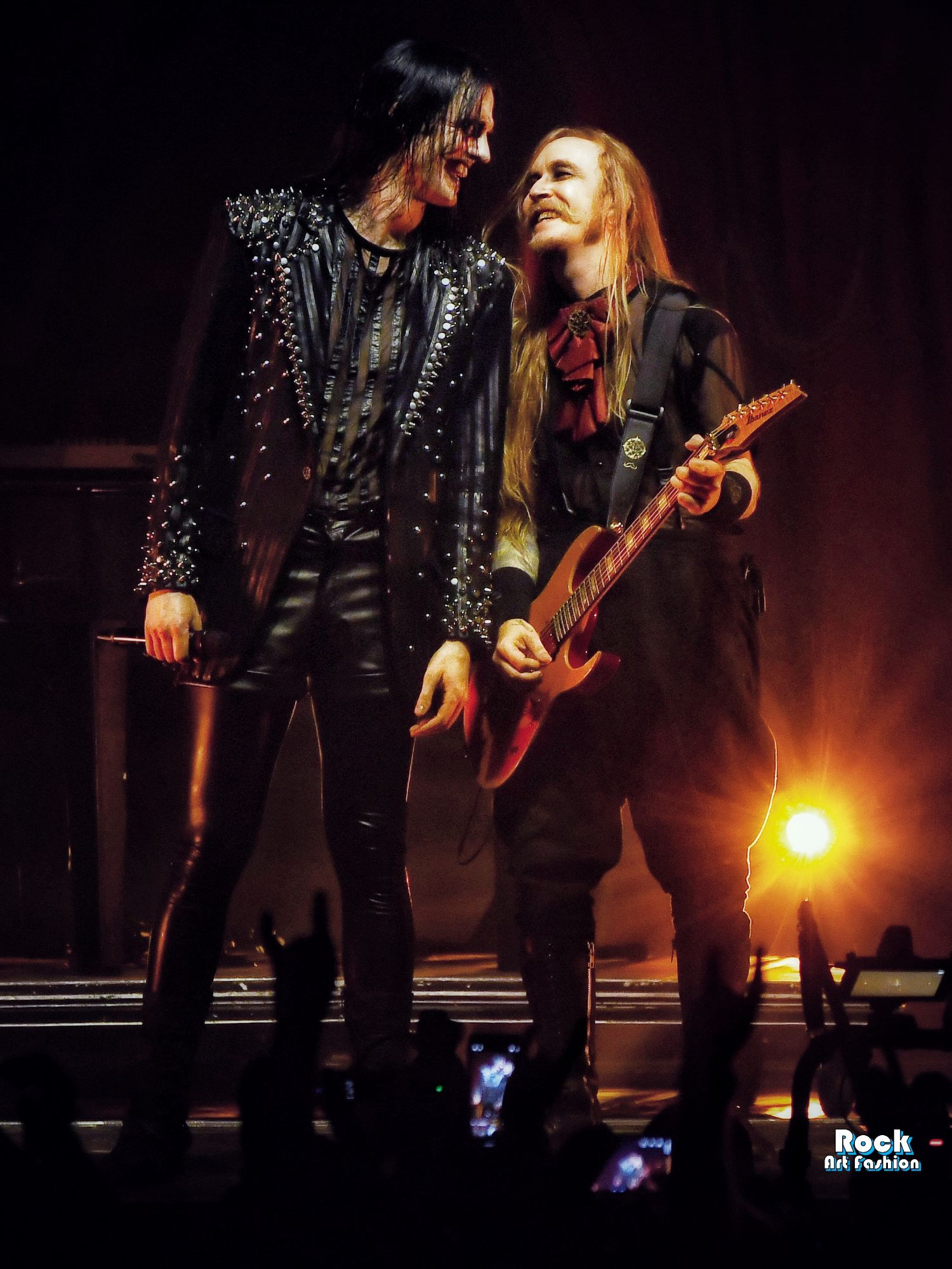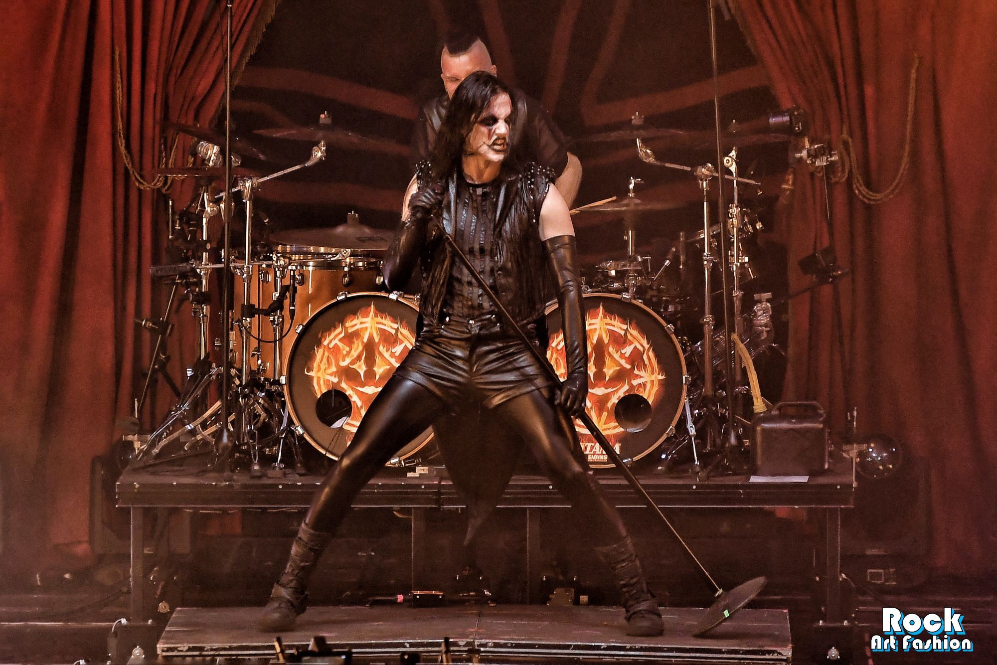 Tonight, if the band wears new clothes: shirts, vests, black pants, red jabots, except for Johannes who wears a satin black top, latex leggings and gloves, leather shorts, the old costumes parade, reminiscent of the different eras of the group: the red coat and black hat of Bloody Angel, the white military jackets of Avatar Country…